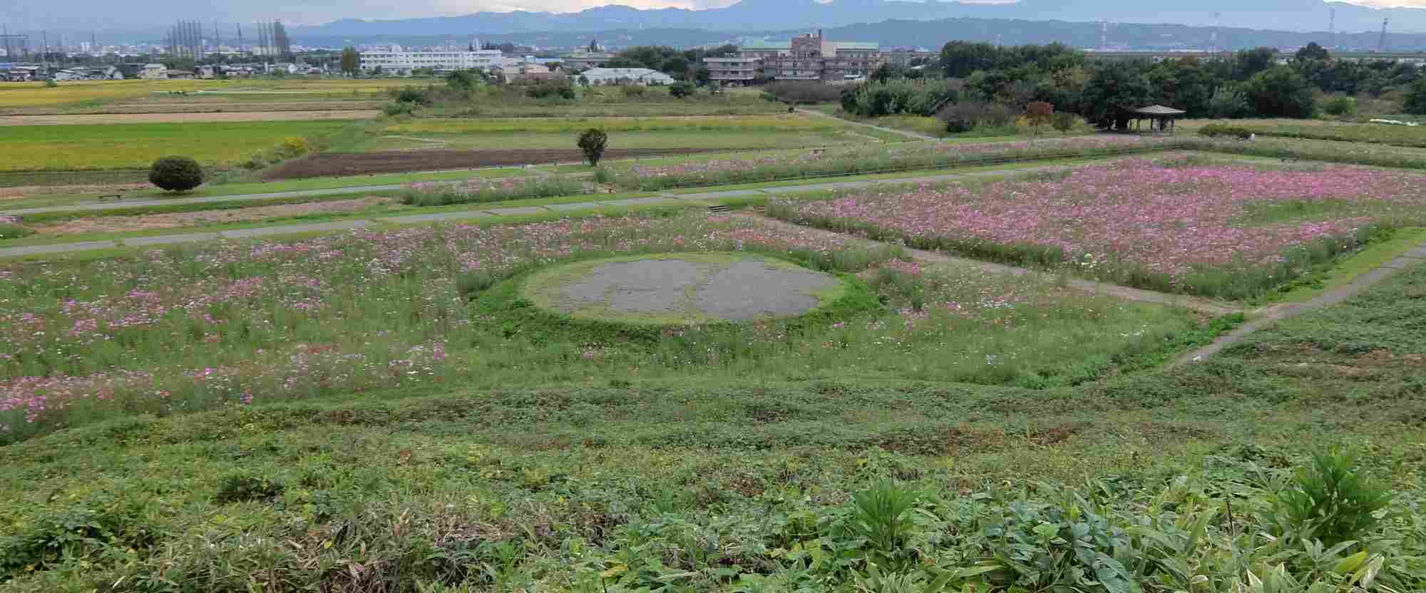 右のコスモスの咲きほこった写真は古墳の上から写した景色です。