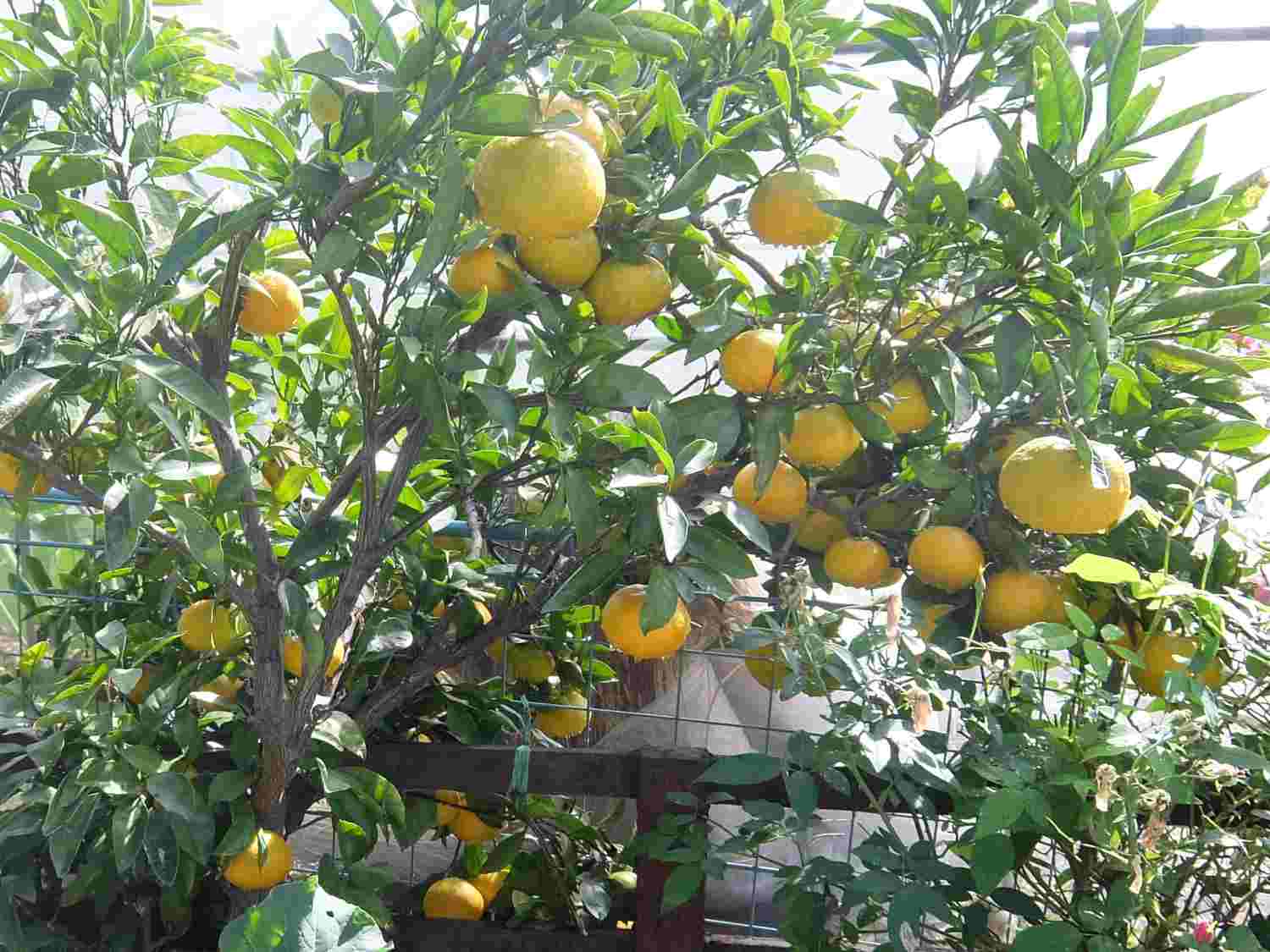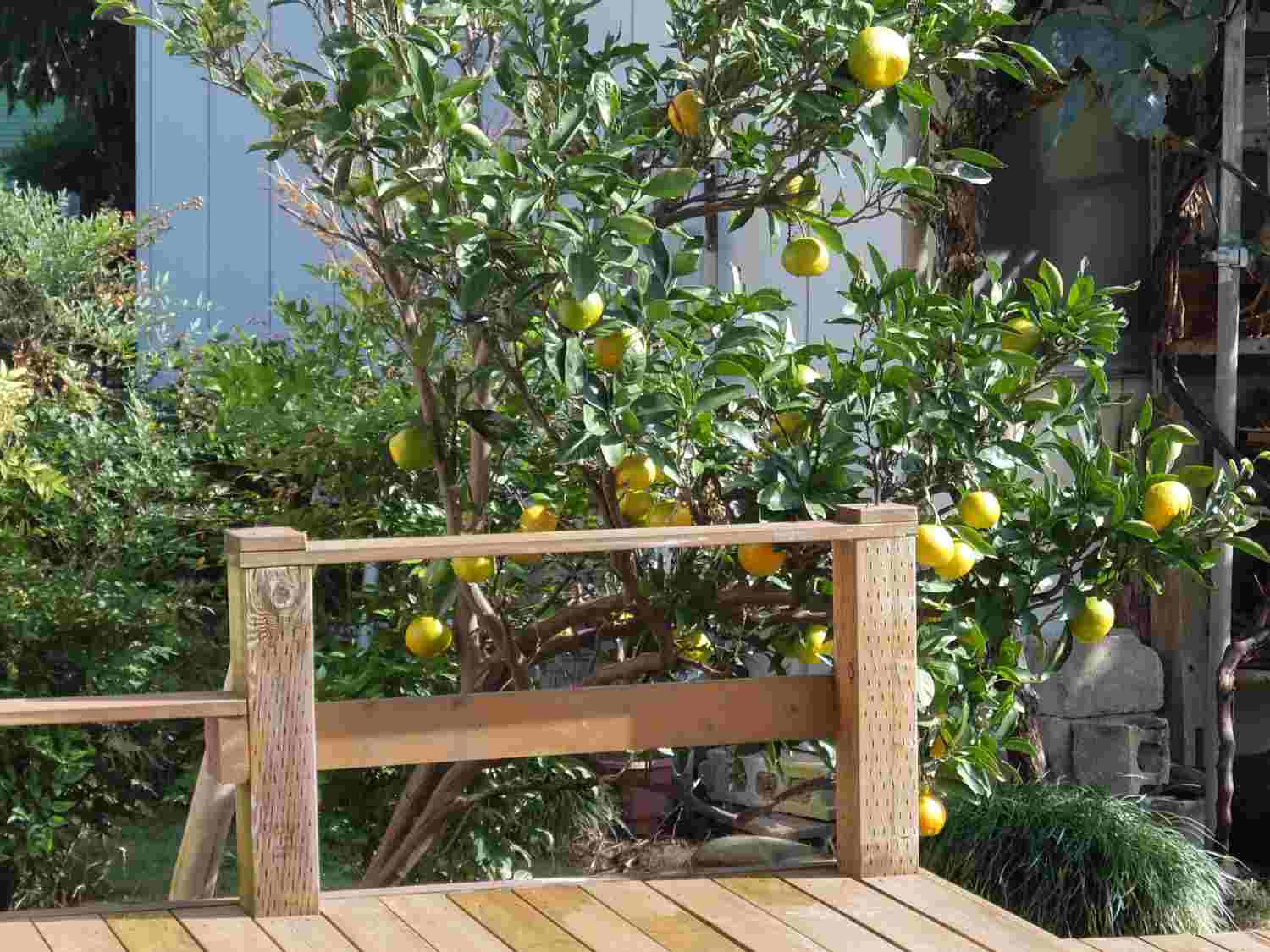 左から家庭菜園の一角にある柚子、デッキの隣にあるミカン