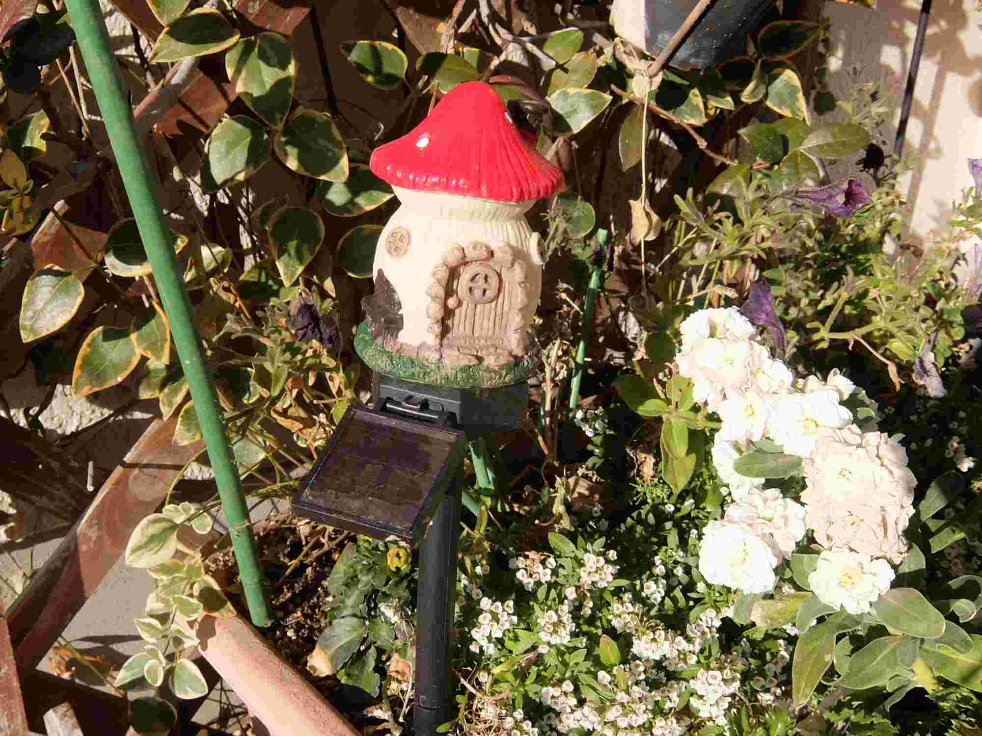 玄関前のプランターにはコビトの家があって、暗くなると点灯します。
