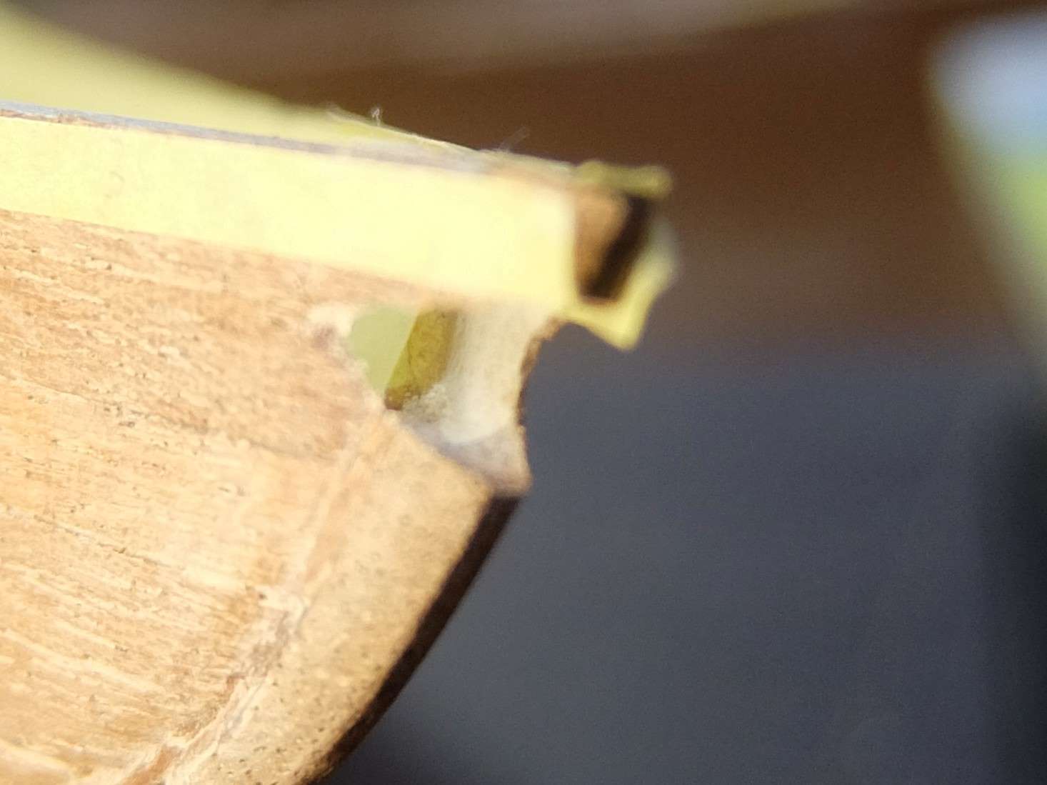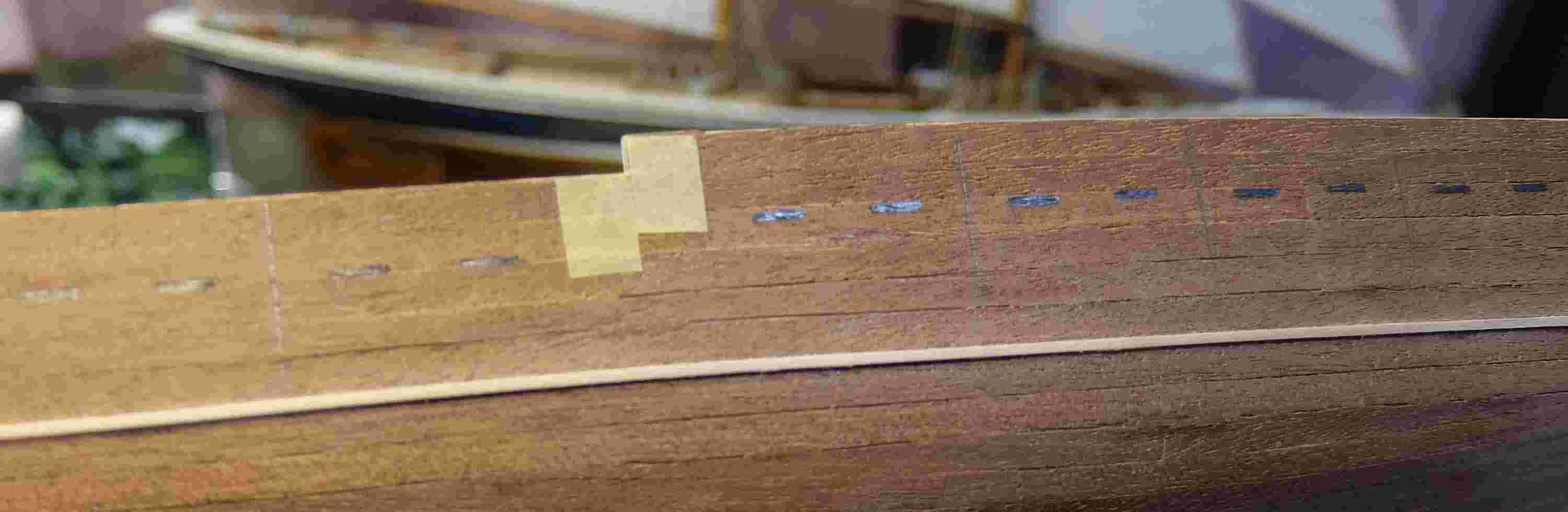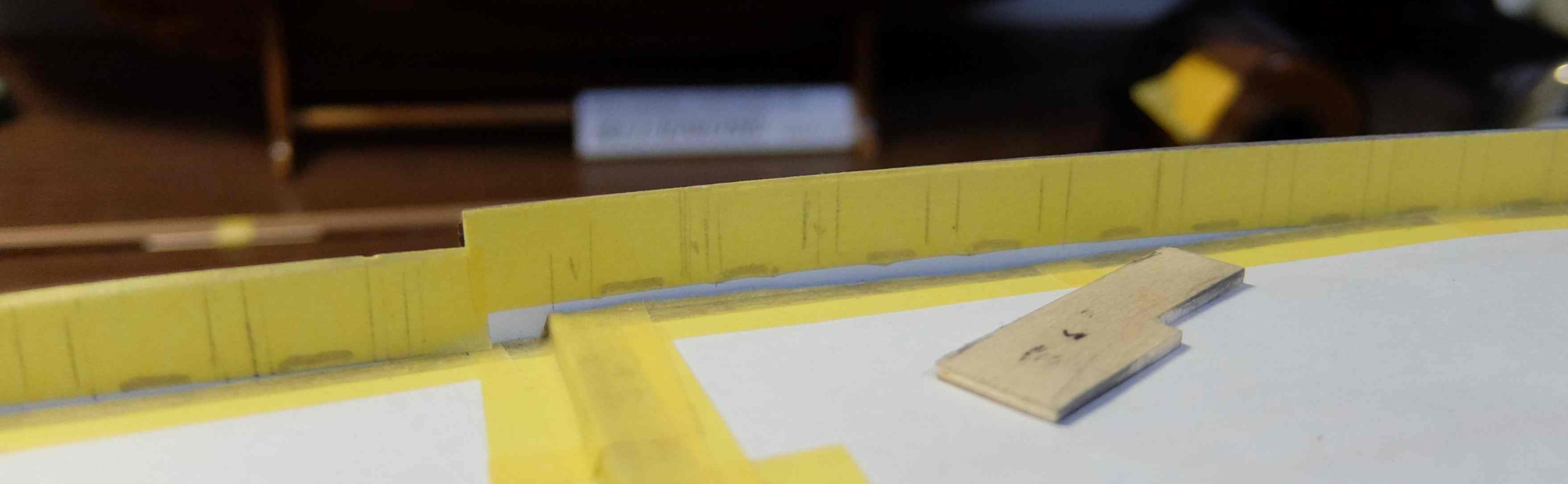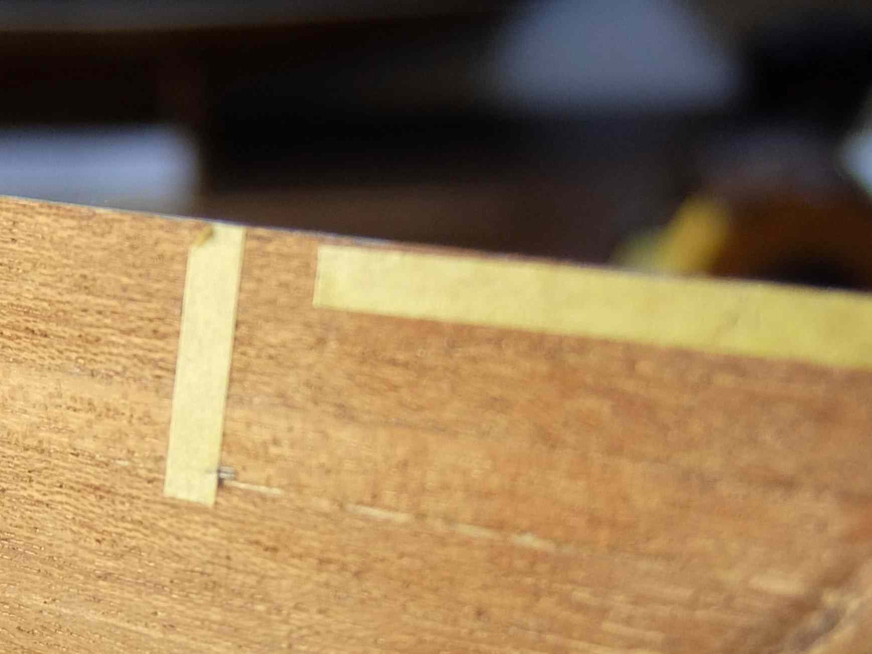 先に施工済のウォーターラインとして張った角材ですが船体側面より0.5mmほど出ています。
