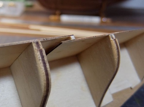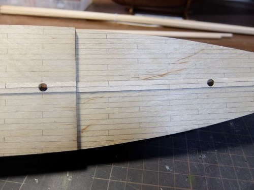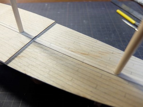 船首と船尾のデッキの段差部に2mm角の角材を据え