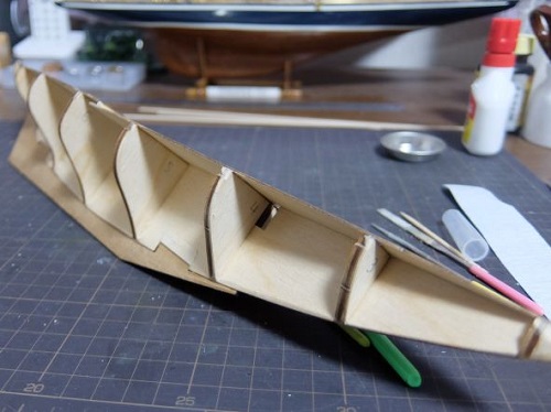 最初の1枚目のところでマストを立てる穴の半円を削って空けておきます。