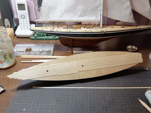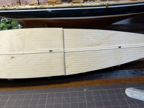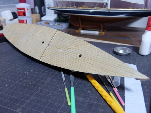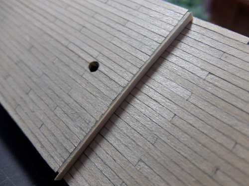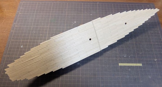 0.5×3.0mmのデッキ材を中央から左右舷へと張っていきます。