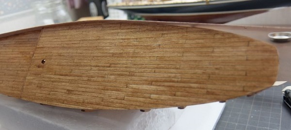 中心を合わせて船尾の板を取付けましたが、真っ平な板なので船尾に馴染んでいません。