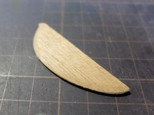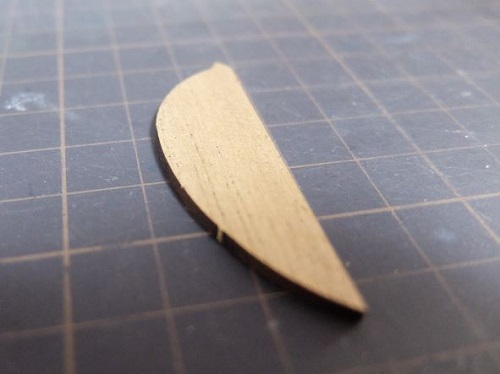 2022年 5月 5日 ラダー(舵)の作成です。 提供されているラダーのパーツは切り出しのままなので ヤスリで削ってそれらしく成形します。 ウォルナット材を張ります。 船体と同じ手順で曲げ曲げしながた張り終えました。 余分な部分を削り落として、ペーパーで軽く仕上げました。 とりあえず、ここまで