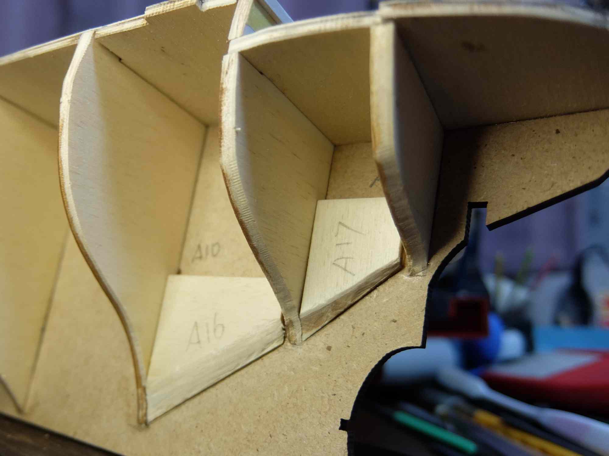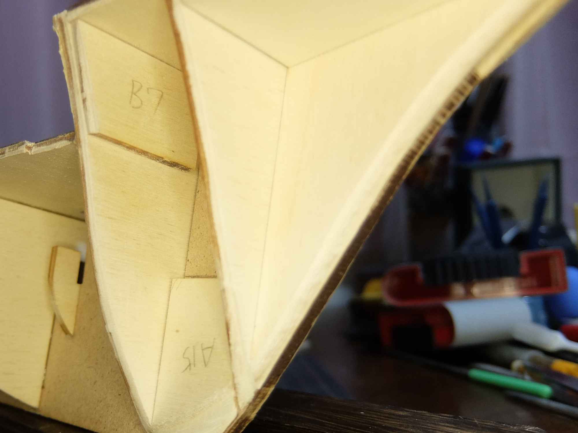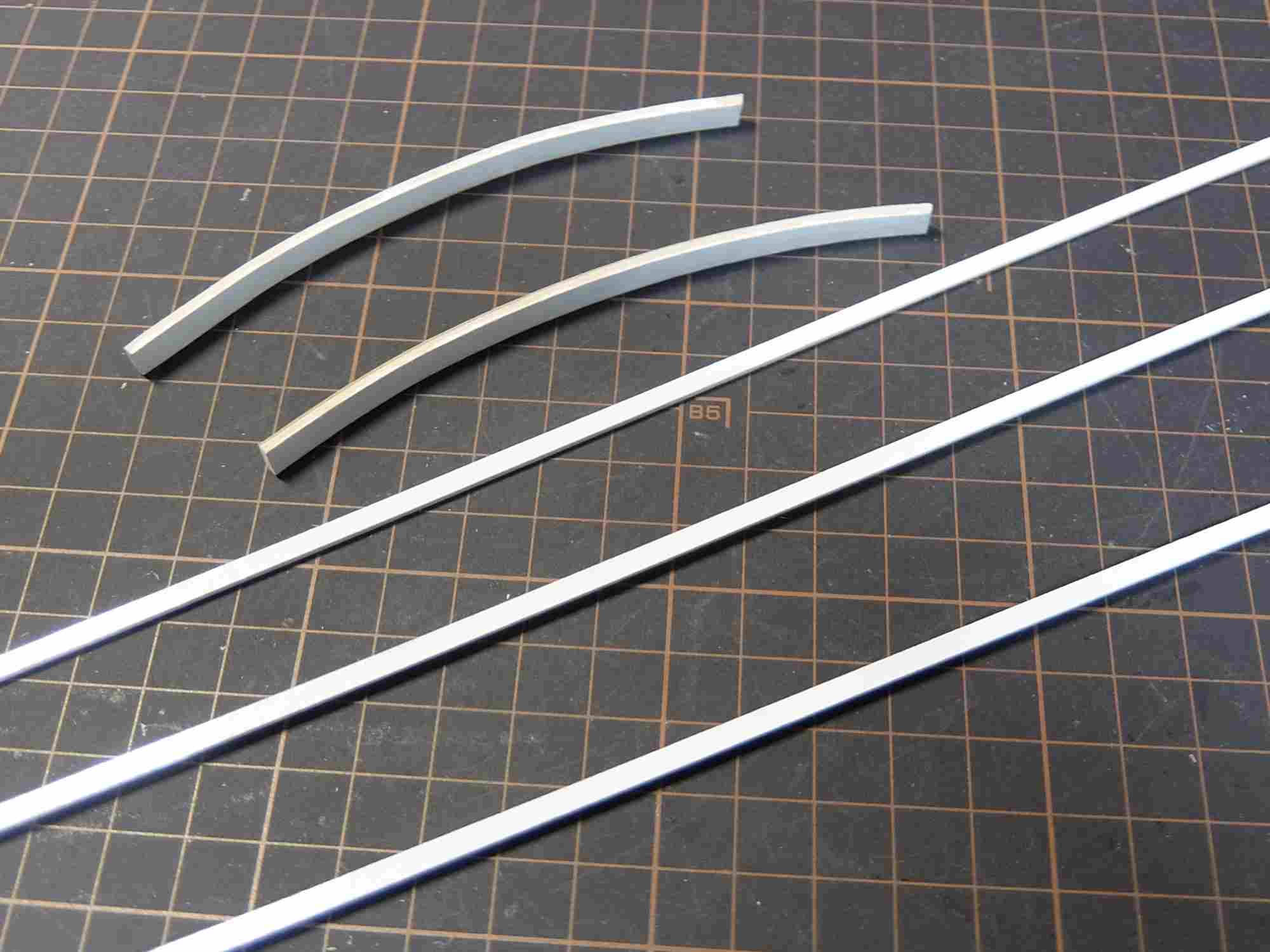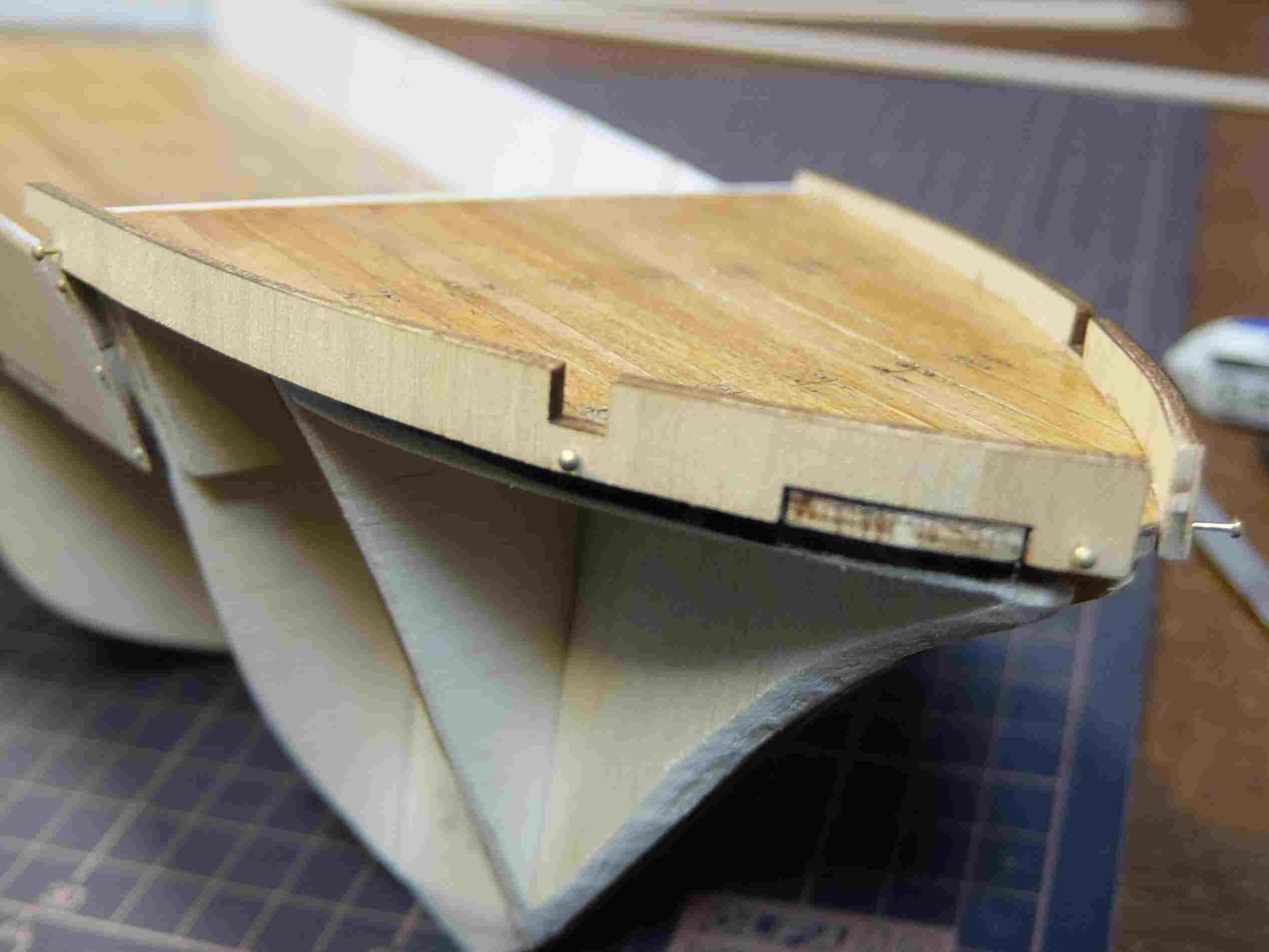 船首、船尾ともに船体の曲線に合うように削り落としました。