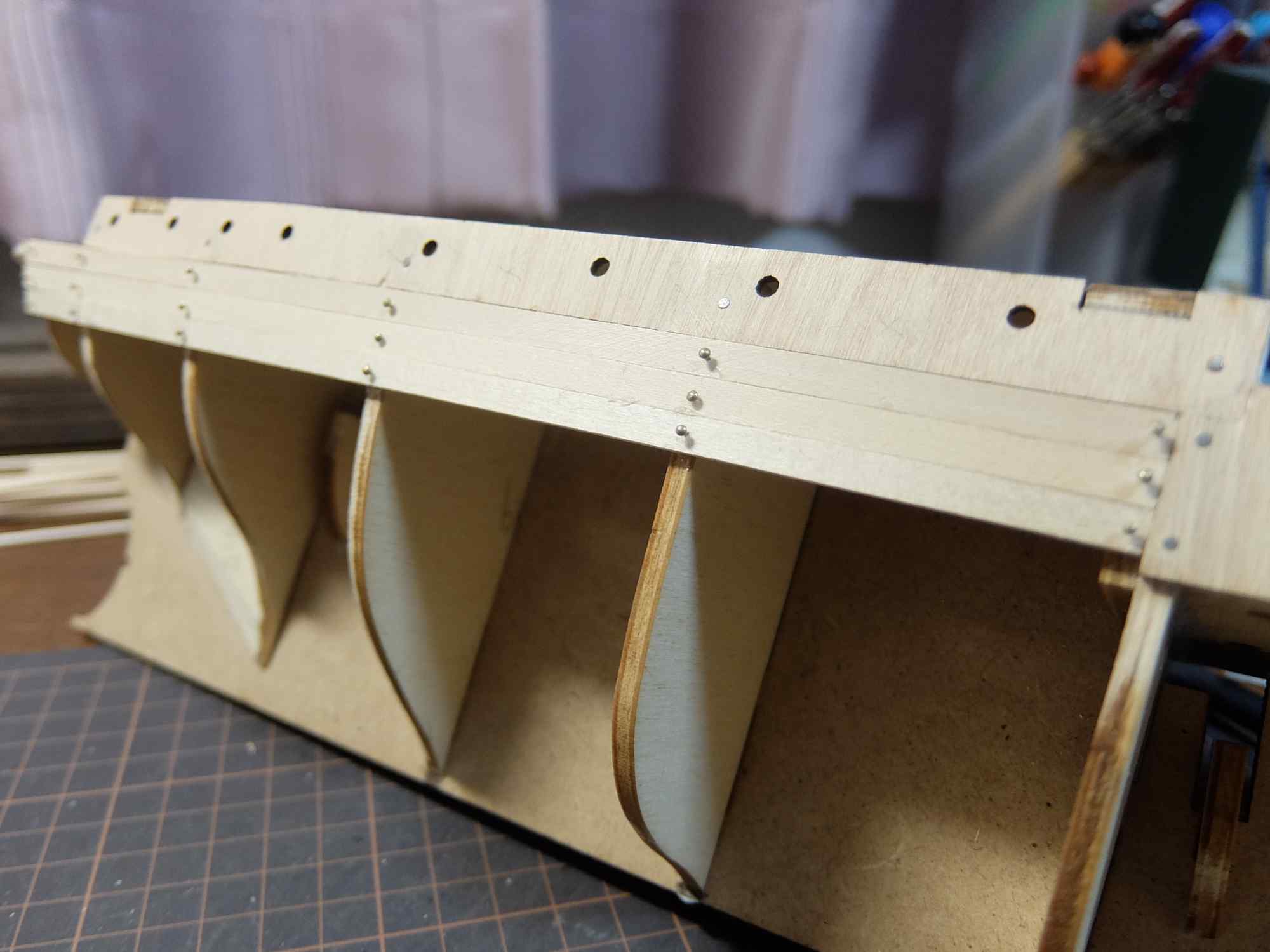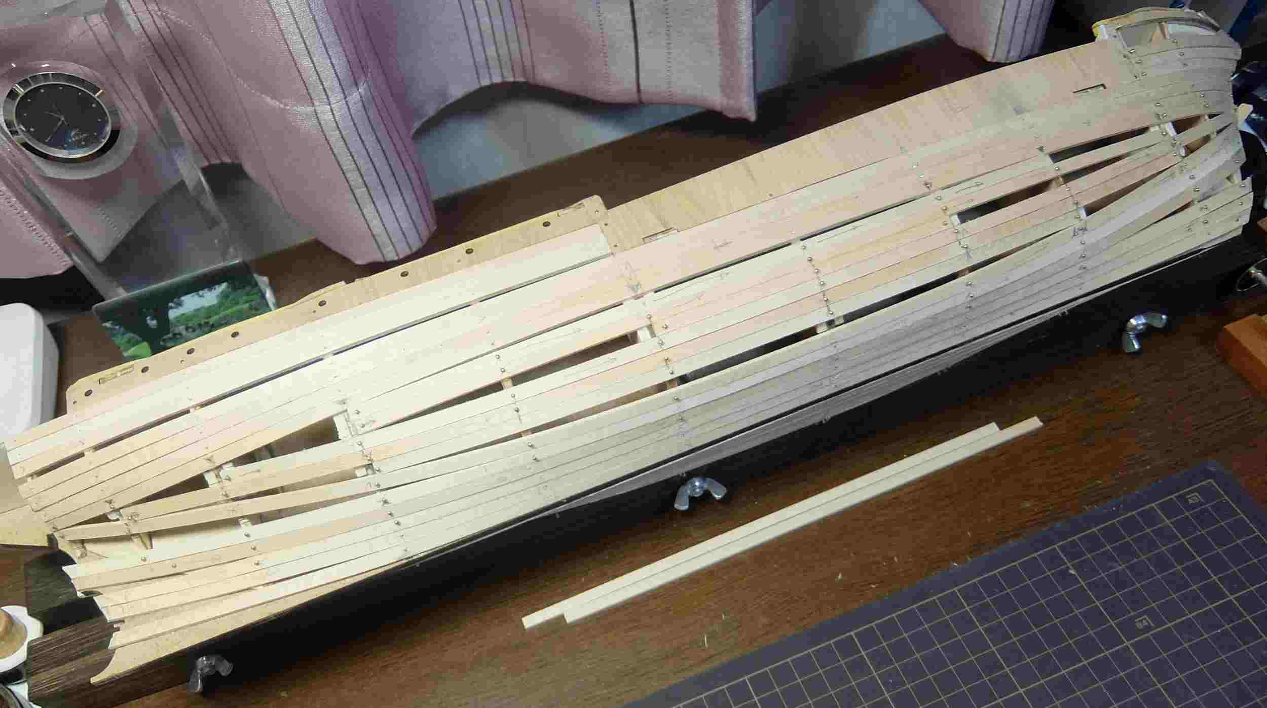 2.0×5×600の船体外板材(下張り)を利用して船体の外板下張りを行います。