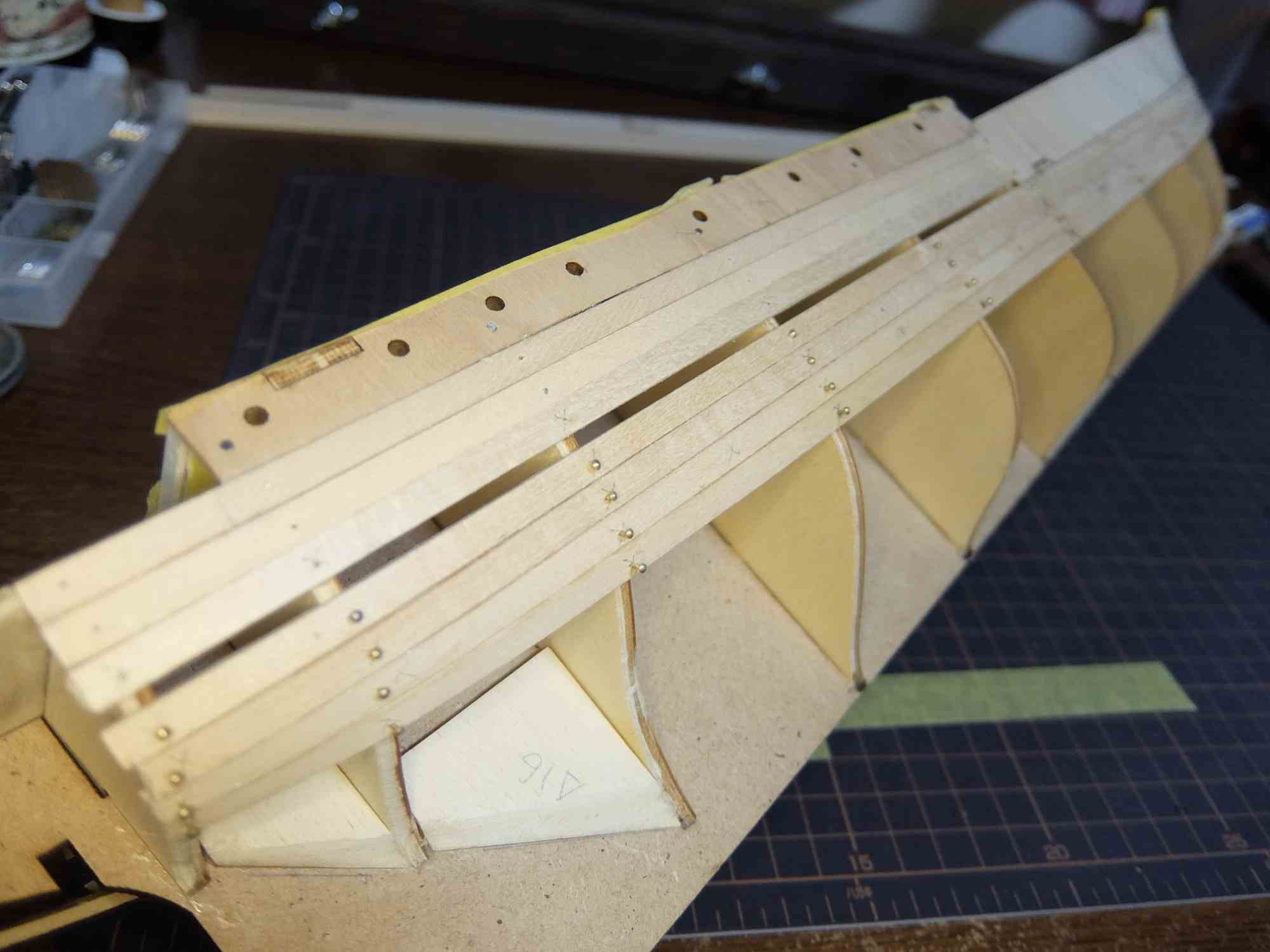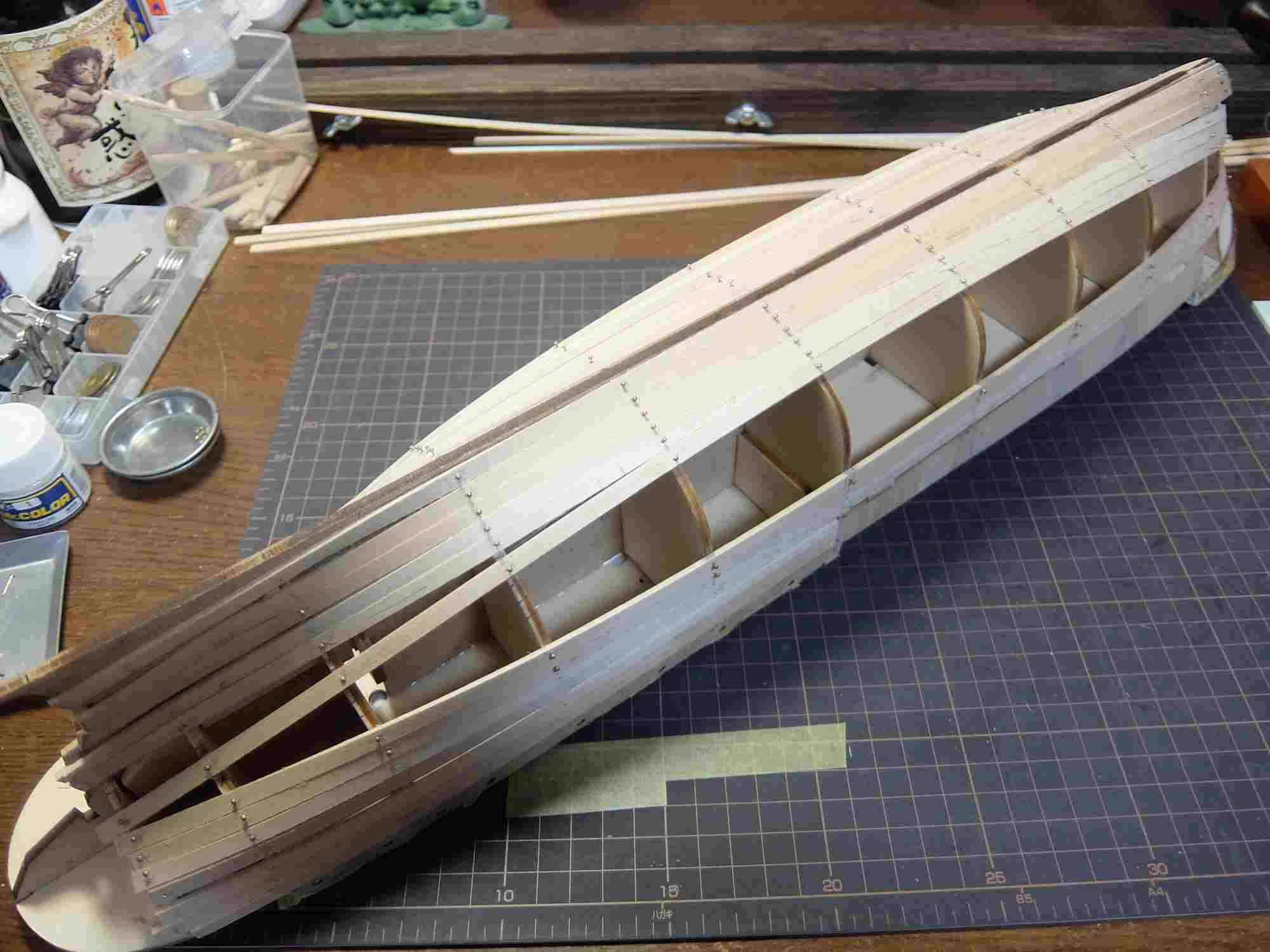 続いて、少し隙間が空いて先端から後部にかけて4枚の板を張ります。
