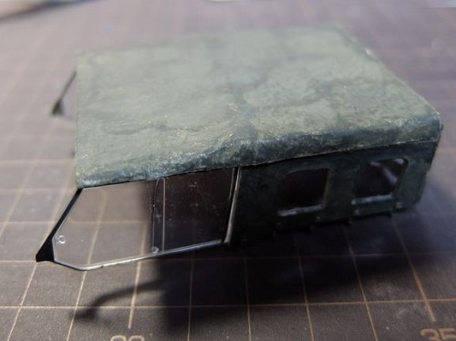 出来上がったフロントウィンドウとキャンパストップを車体に組み込み。