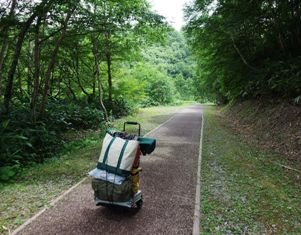 自前のキャリヤーに荷物一式を運んでテントサイトまで