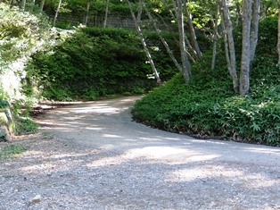 木々の間の山道を30分ほど登って行くと車道に出ます。