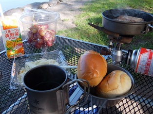 焚火の先には夕暮れの静かな湖面。明るく見えますが、この時点で19時30分です。