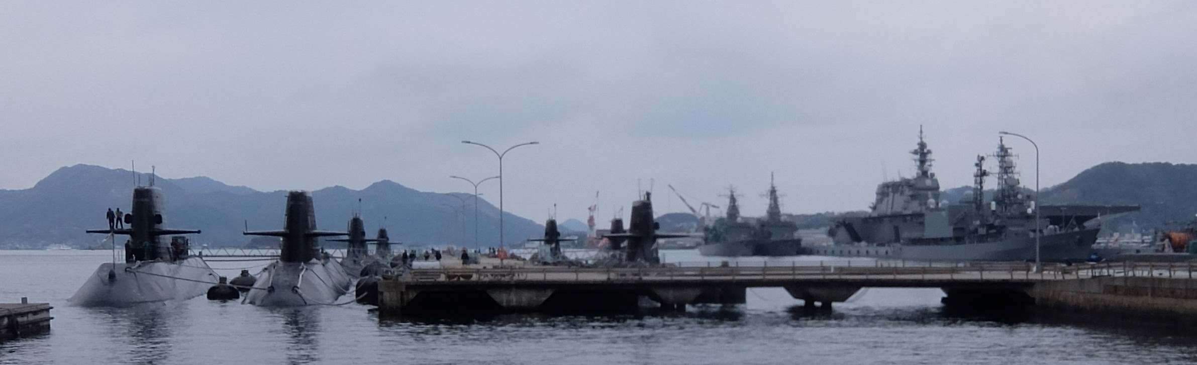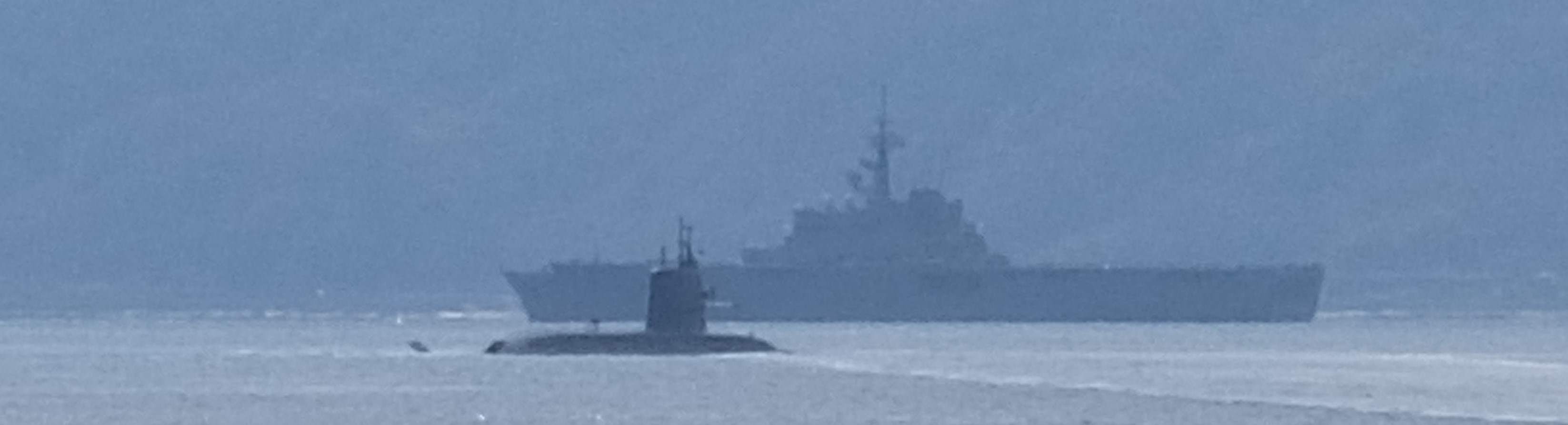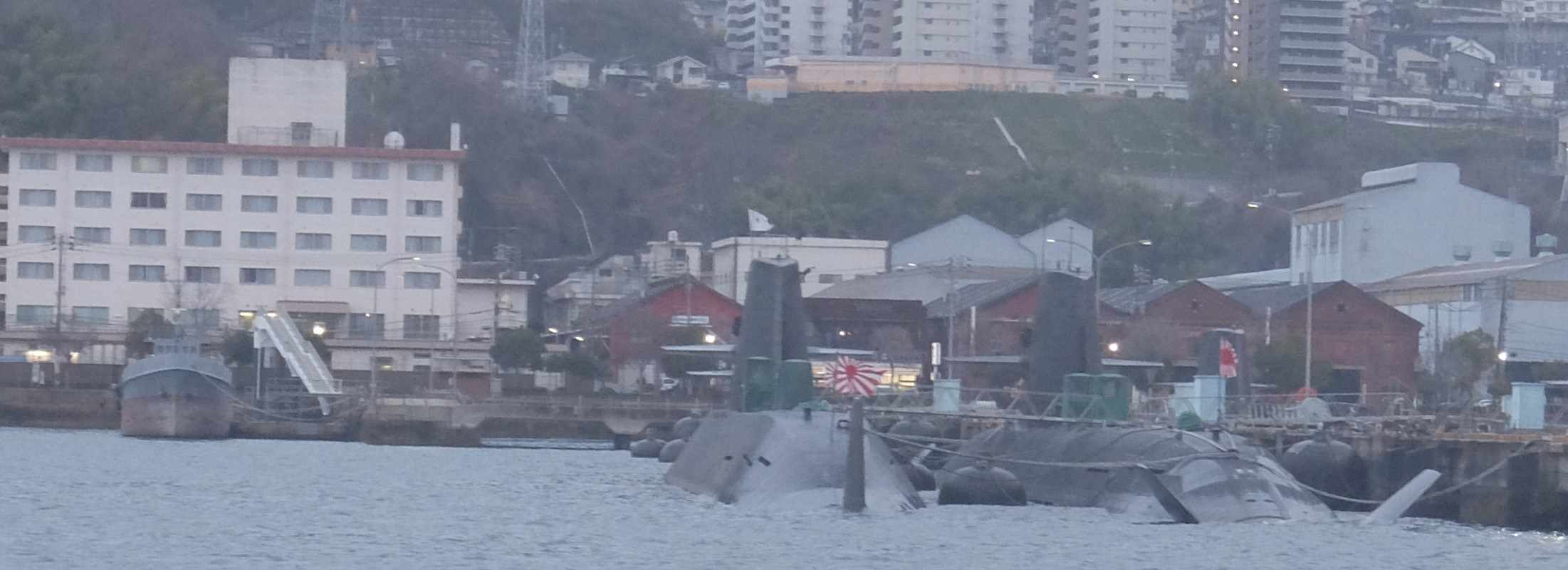 湾内に昨日見た艦船の一艘と手前には潜水艦が移動しているのが見えました。