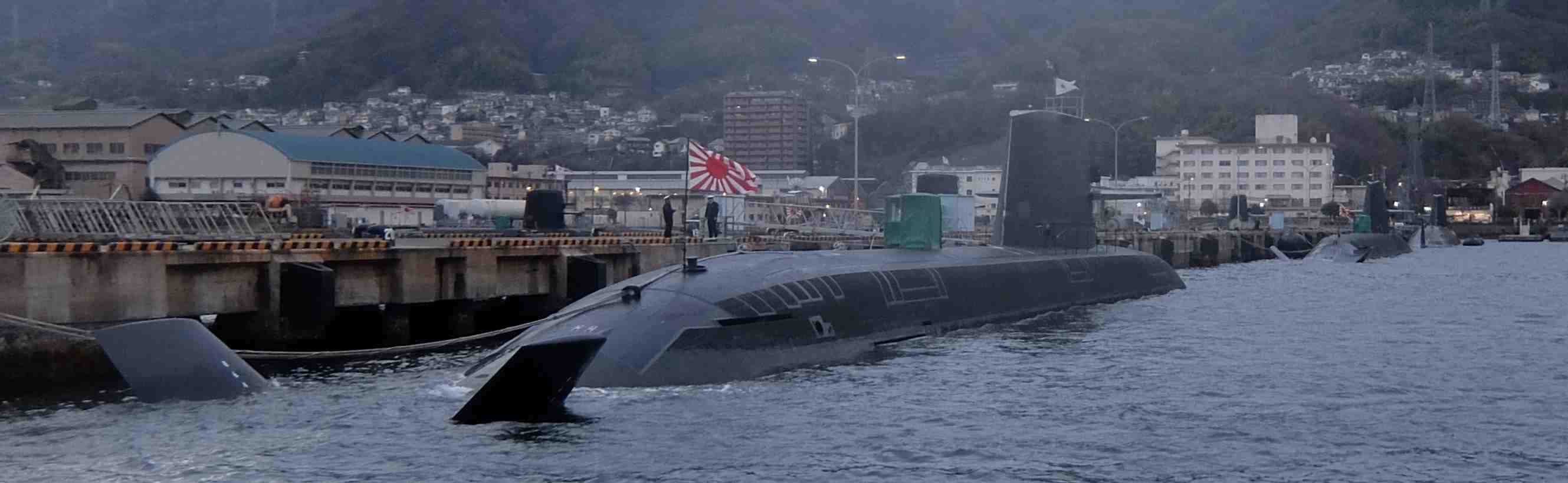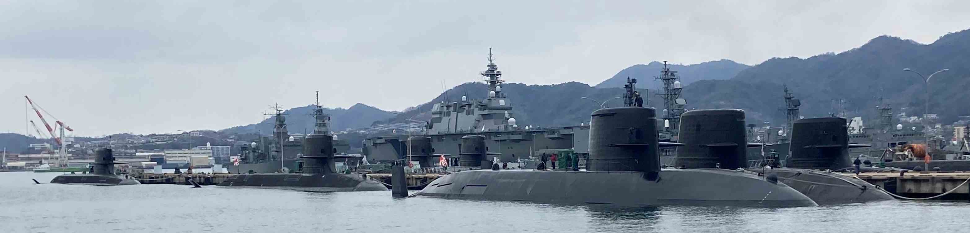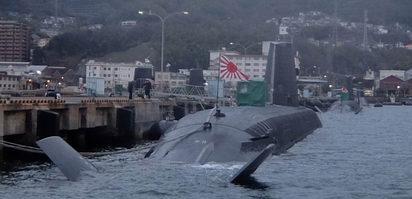 湾内に昨日見た艦船の一艘と手前には潜水艦が移動しているのが見えました。
