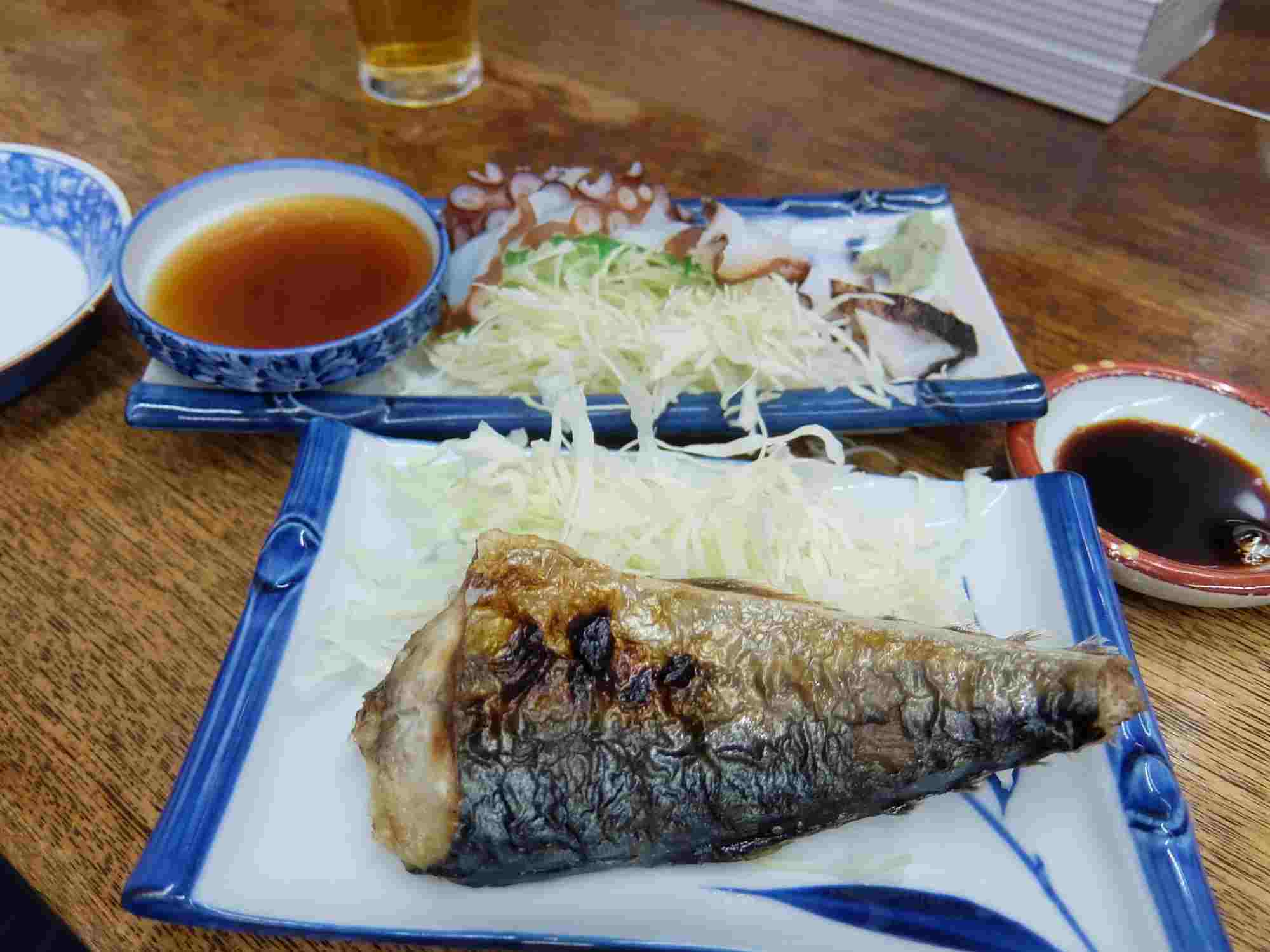 タコ刺しとサバの焼いたのもってきて、ビンビールで乾杯
