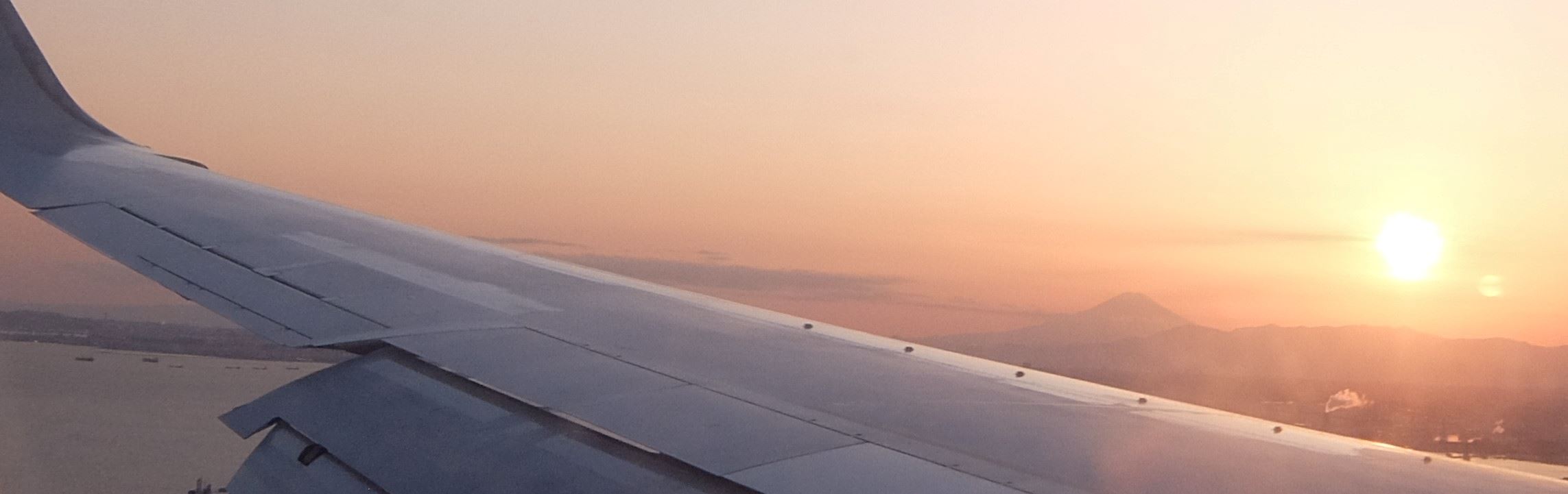 夕暮れ時、もうすぐ羽田、富士山と夕日が窓から見えました。