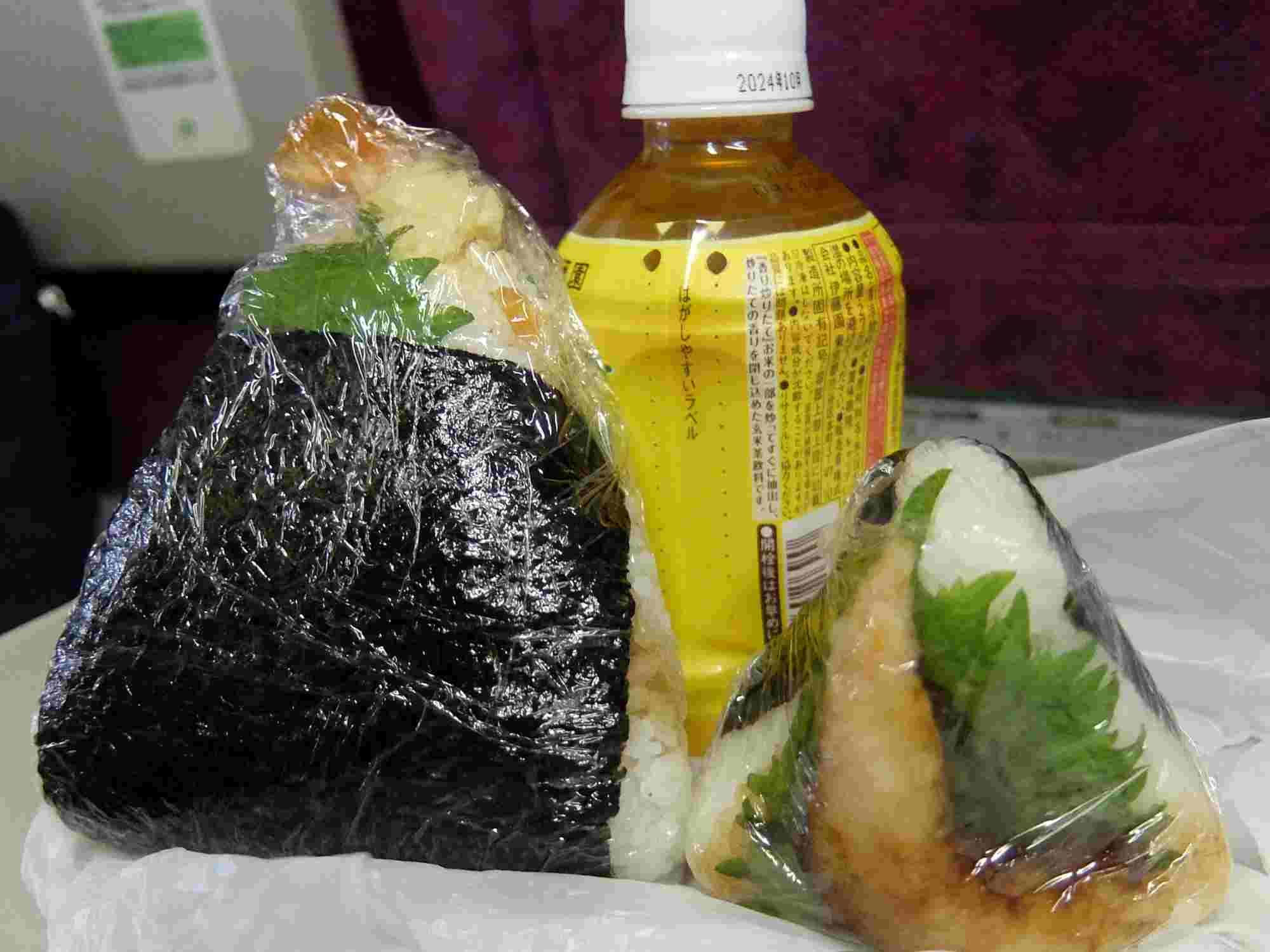 東京上野ラインの車内で神戸空港て買っておいた”天むす”をいただく