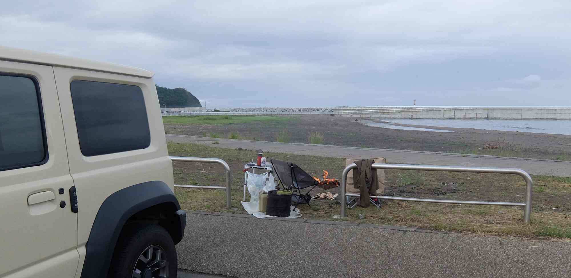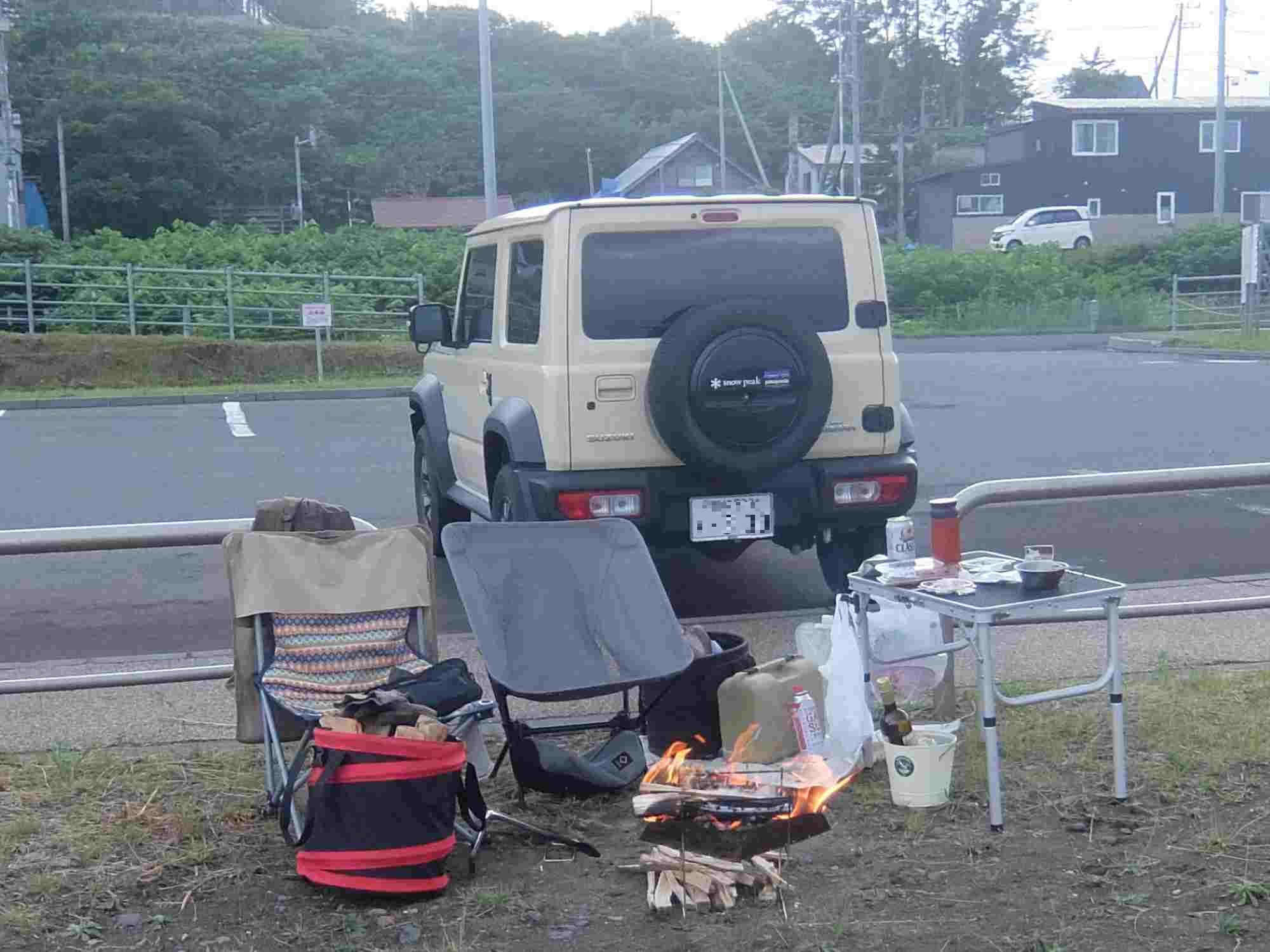 今日も寝るのは車中ですが、テーブルとイスを出して焚火も行いました。