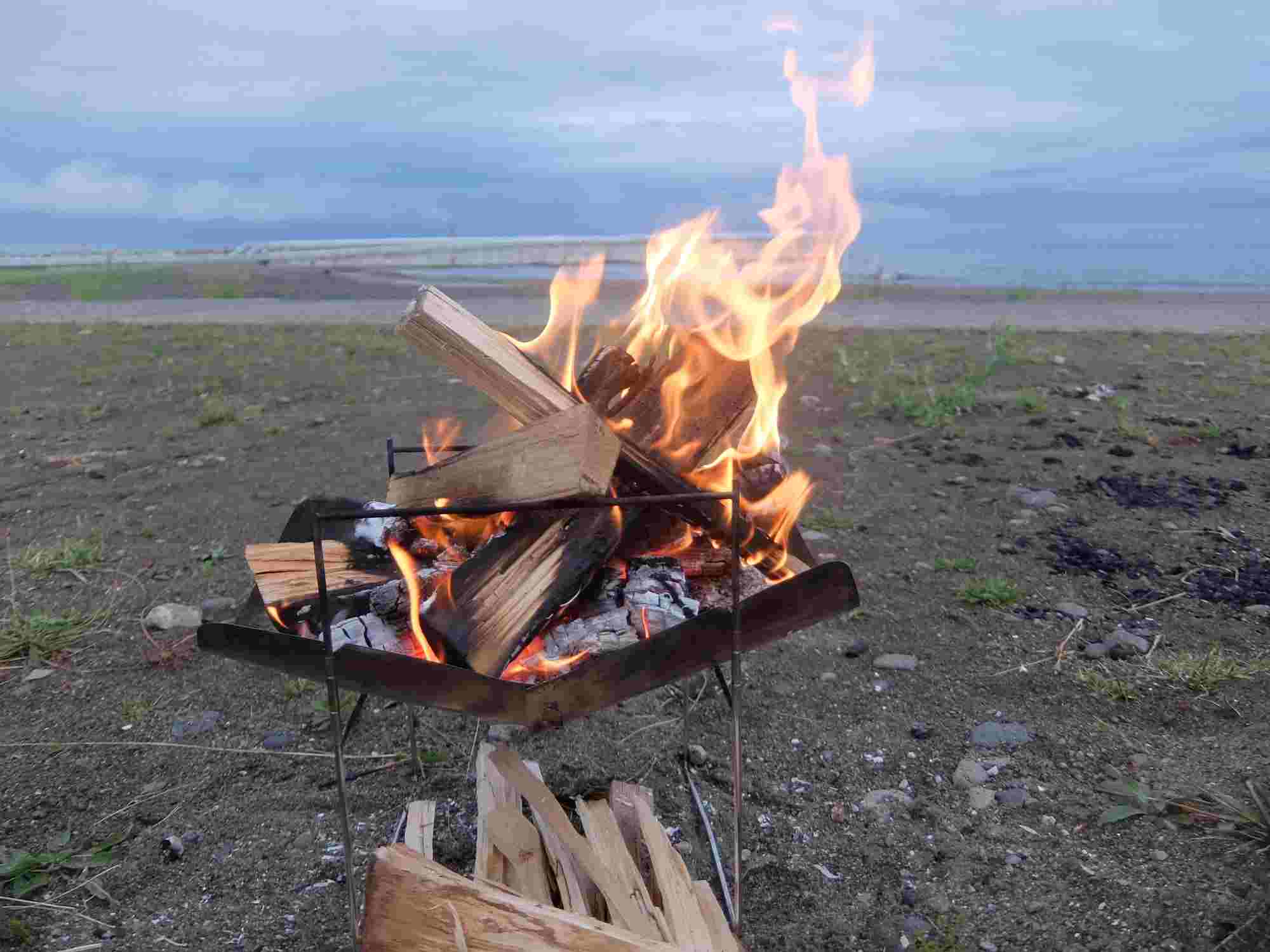 芝生焼け防止のブロックはあって、持ち込んだ薪で焚火。