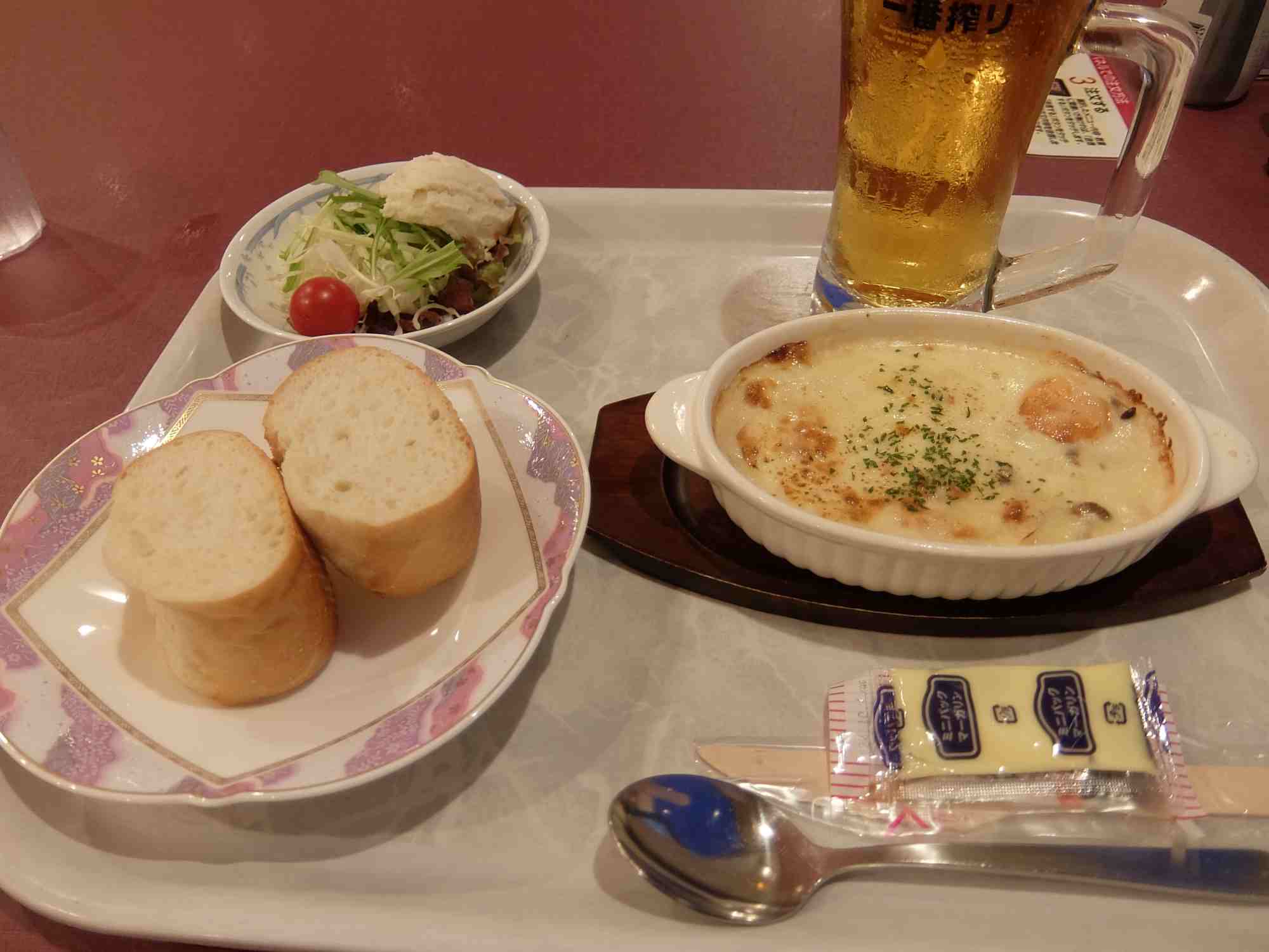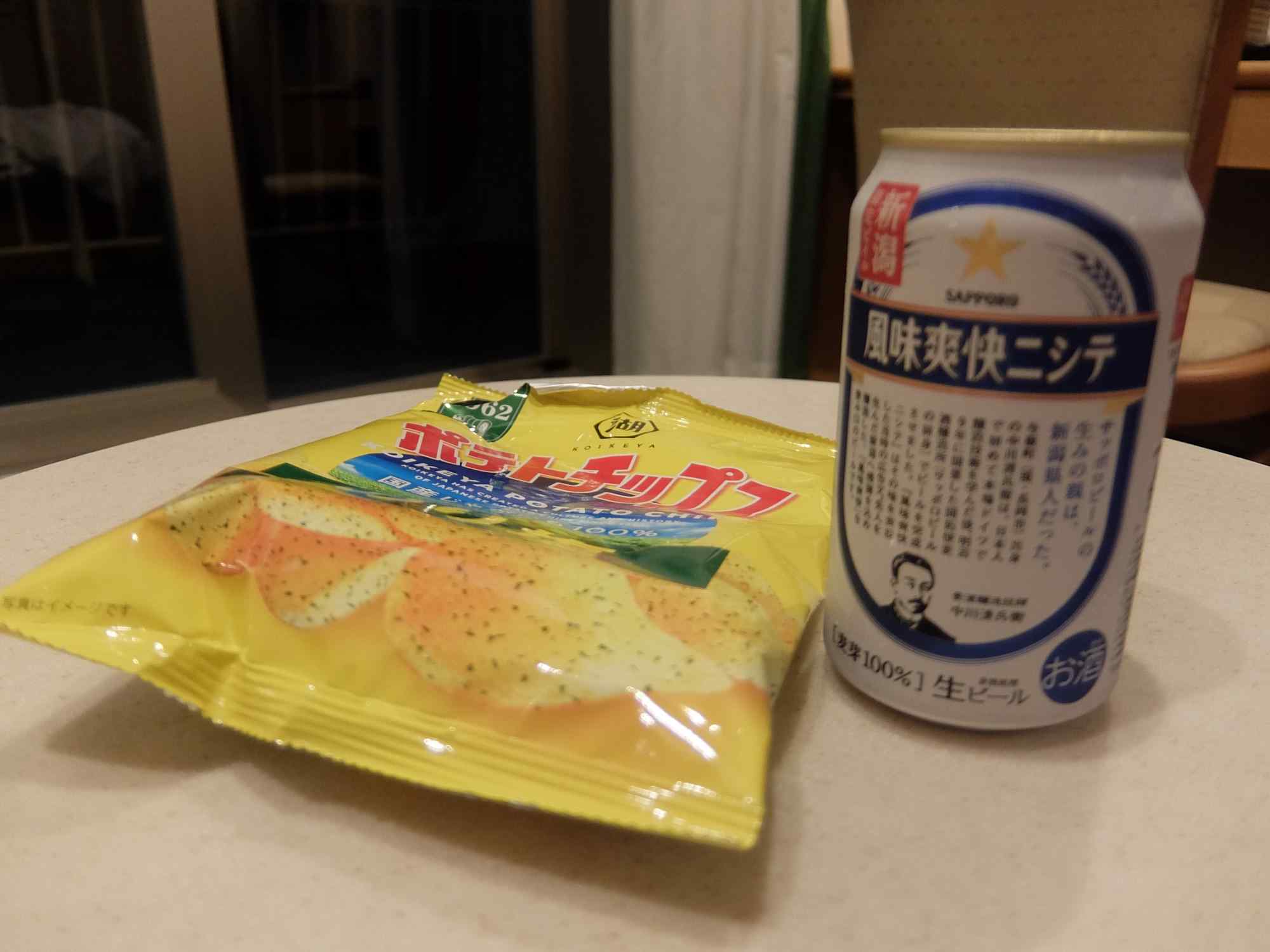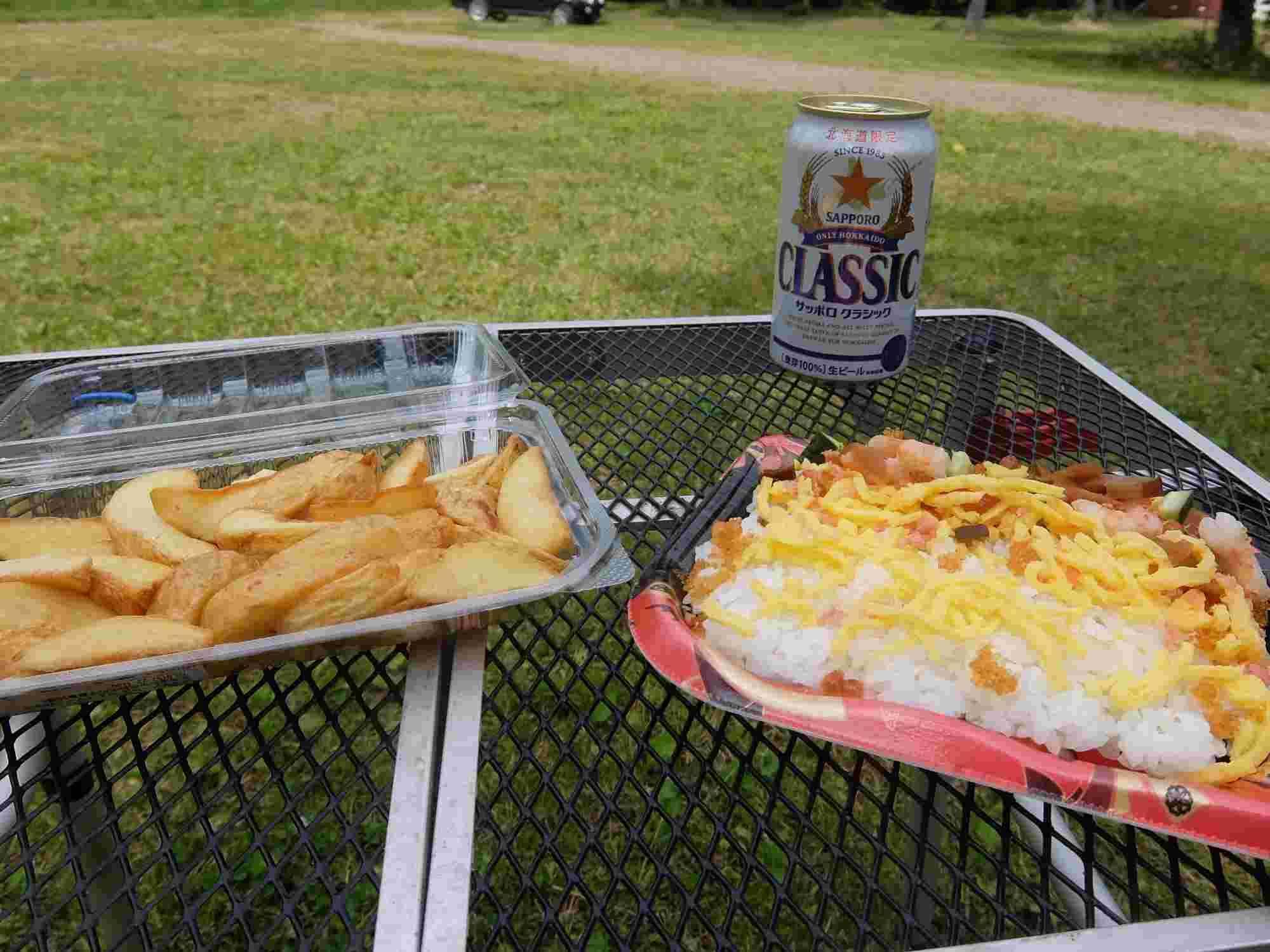 昼食:スーパーで買ったちらし寿司と夜食用のポテト ビールを添えて
