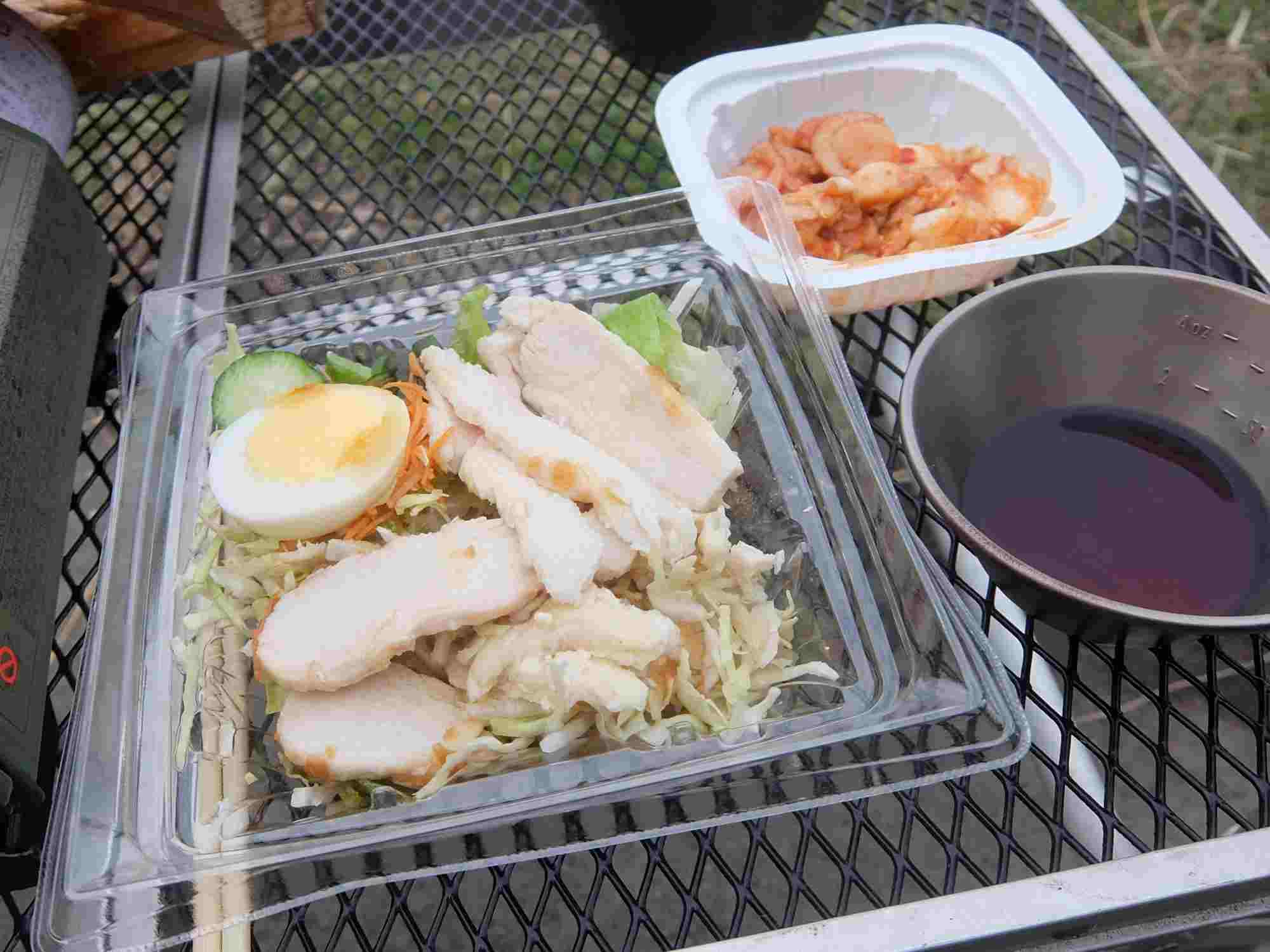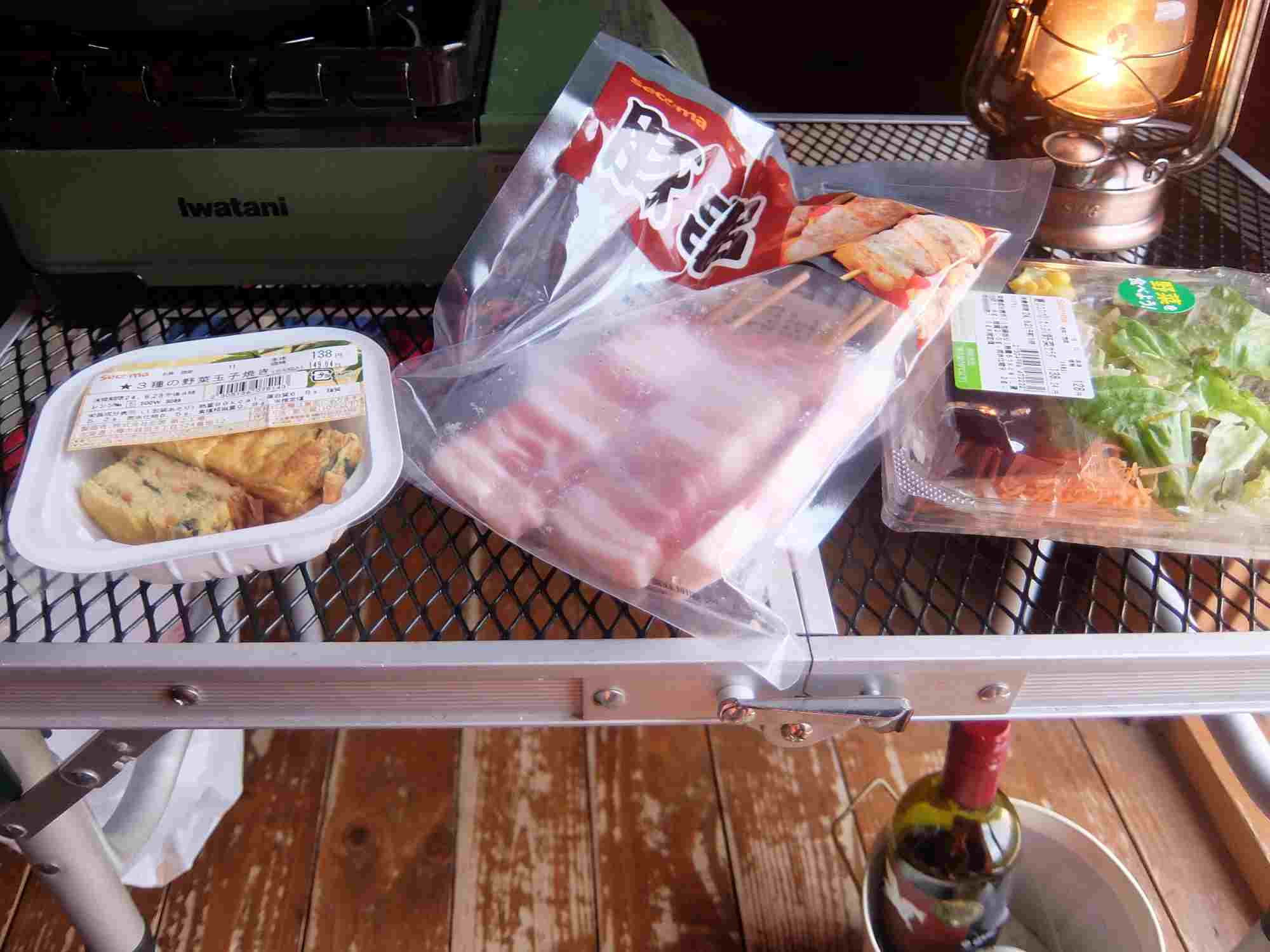 地元のスーパーで買った「炭火焼きとり ねぎま、真いかのサラダ、チーズ(2個)