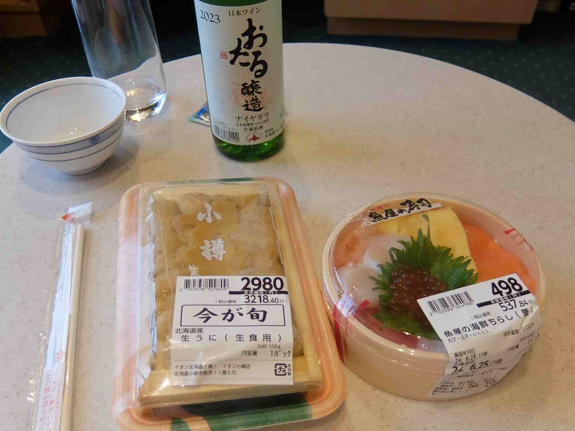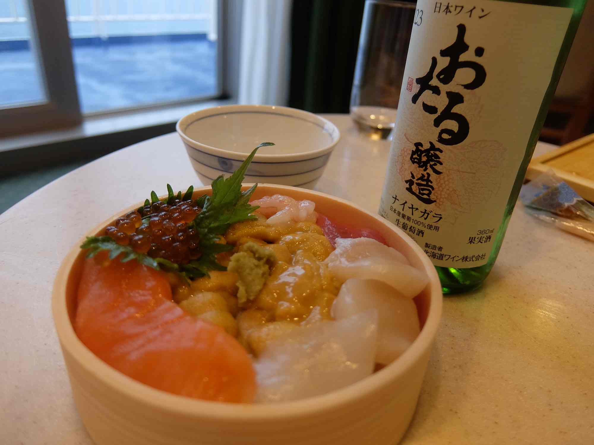 夕食:小樽のスーパーで買った”生うに”と”海鮮ちらし” 小樽醸造の白ワインを添えて