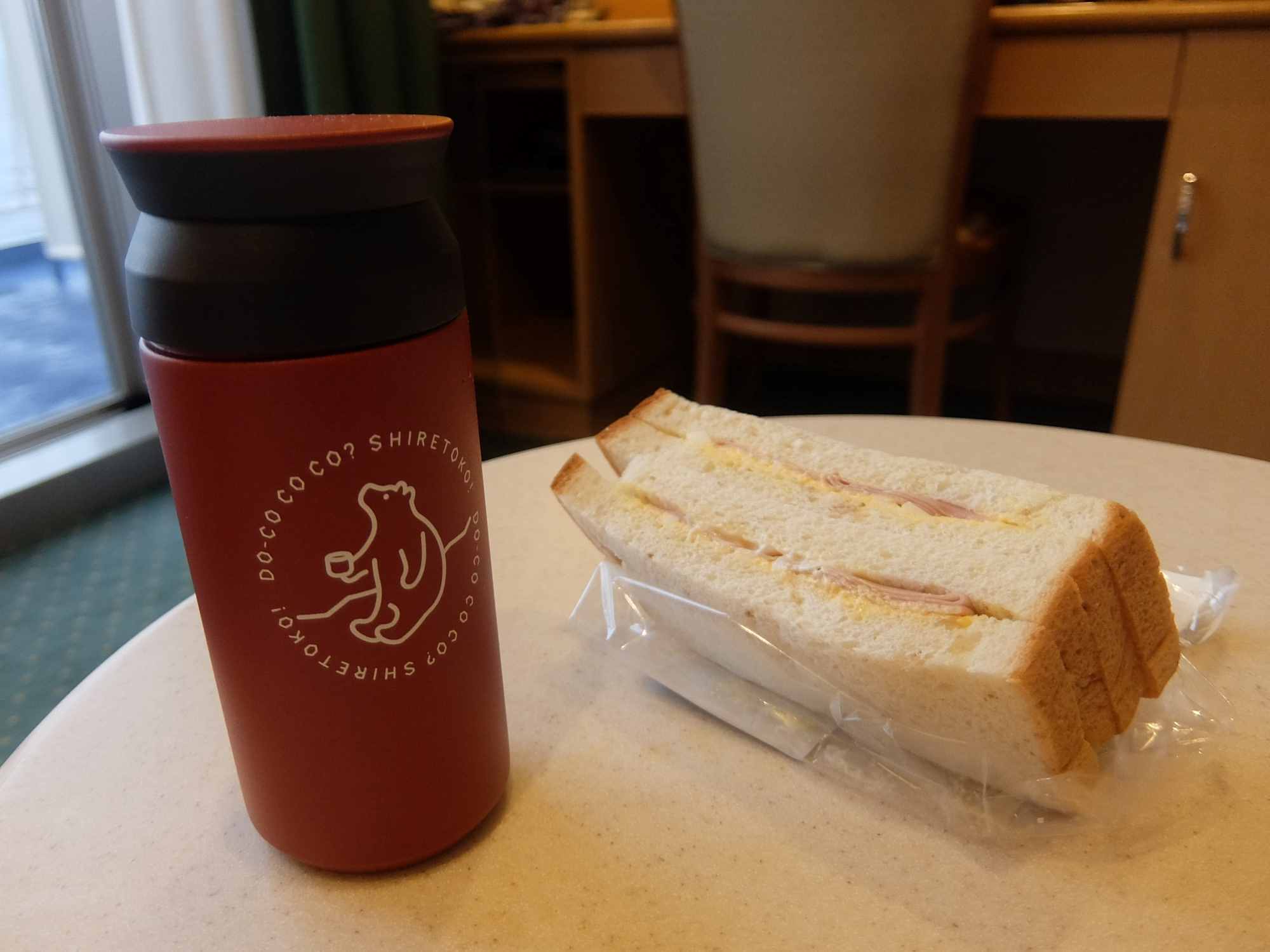 昼食:小樽のスーパーで買っておいたハムたまごサンド & ドリップコーヒー