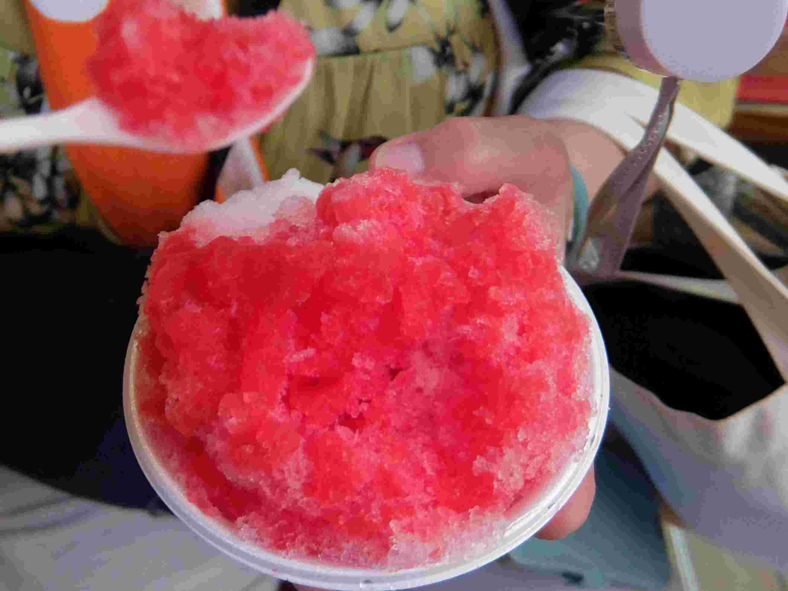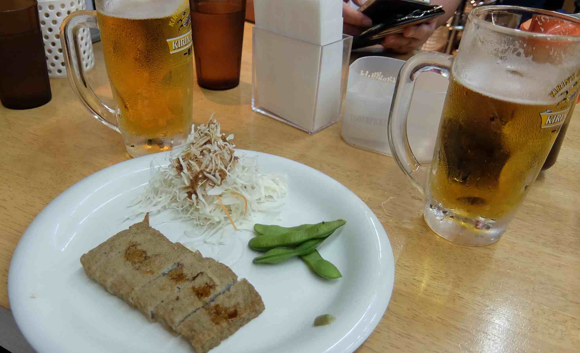 暑い中を参拝し終えてのレモンビール、妻はかき氷