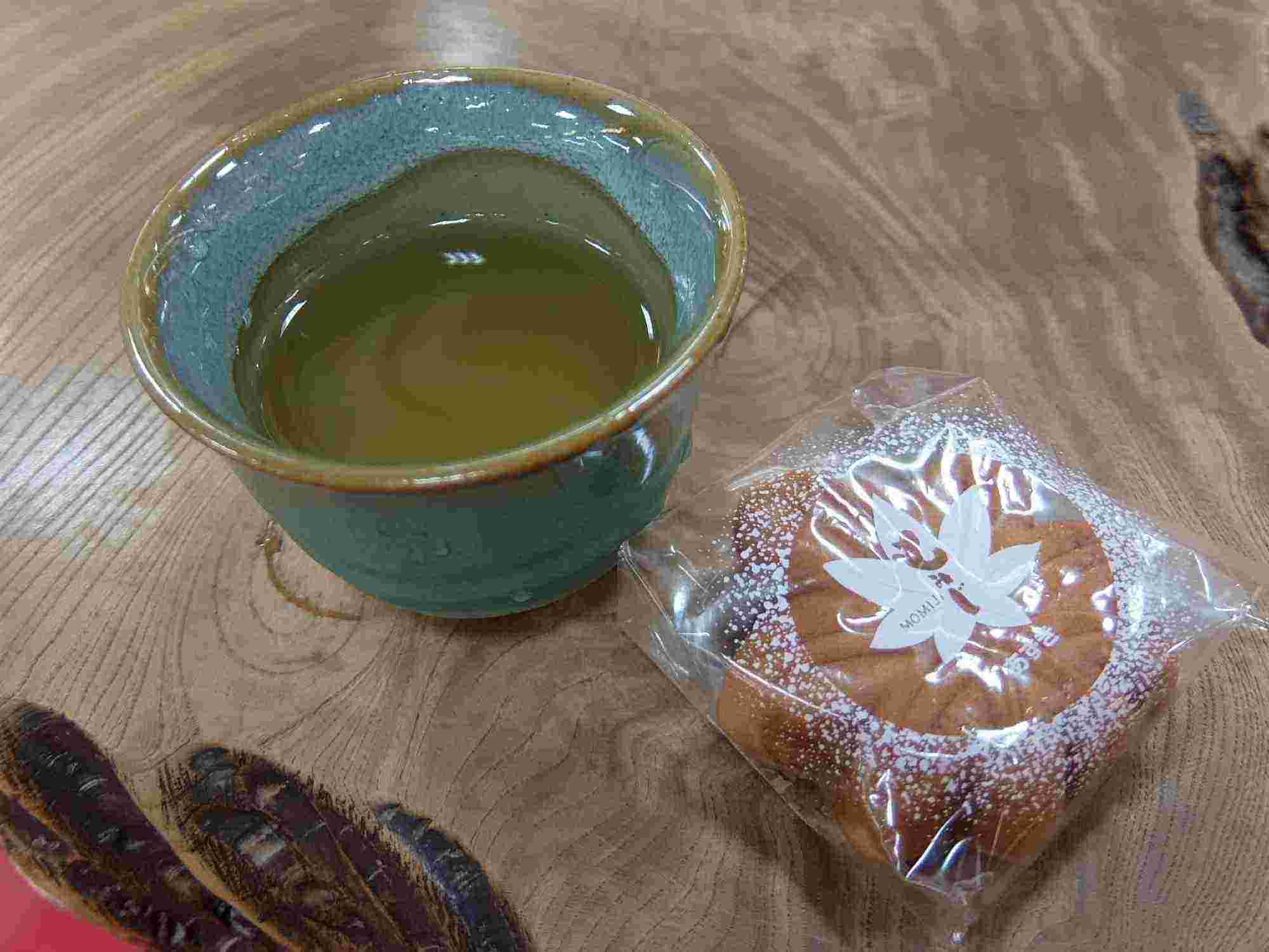 厳島神社をガイドしてくれた”だいこん屋”さんでもみじ饅頭に冷たいお茶 「ごちそうさんでした」