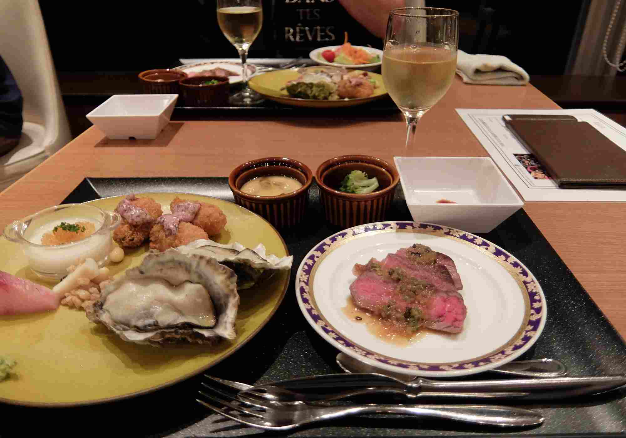 最上階のビュッフェでバイキング形式の夕食 お酒は白ワインをチョイス