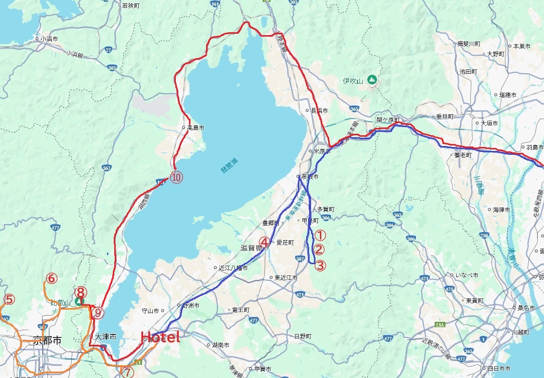 Hotel ⇒ G比叡山延暦寺(西塔拝観) ⇒ 旧竹林院 ⇒ 白髭神社 ⇒ 岐阜羽鳥駅
