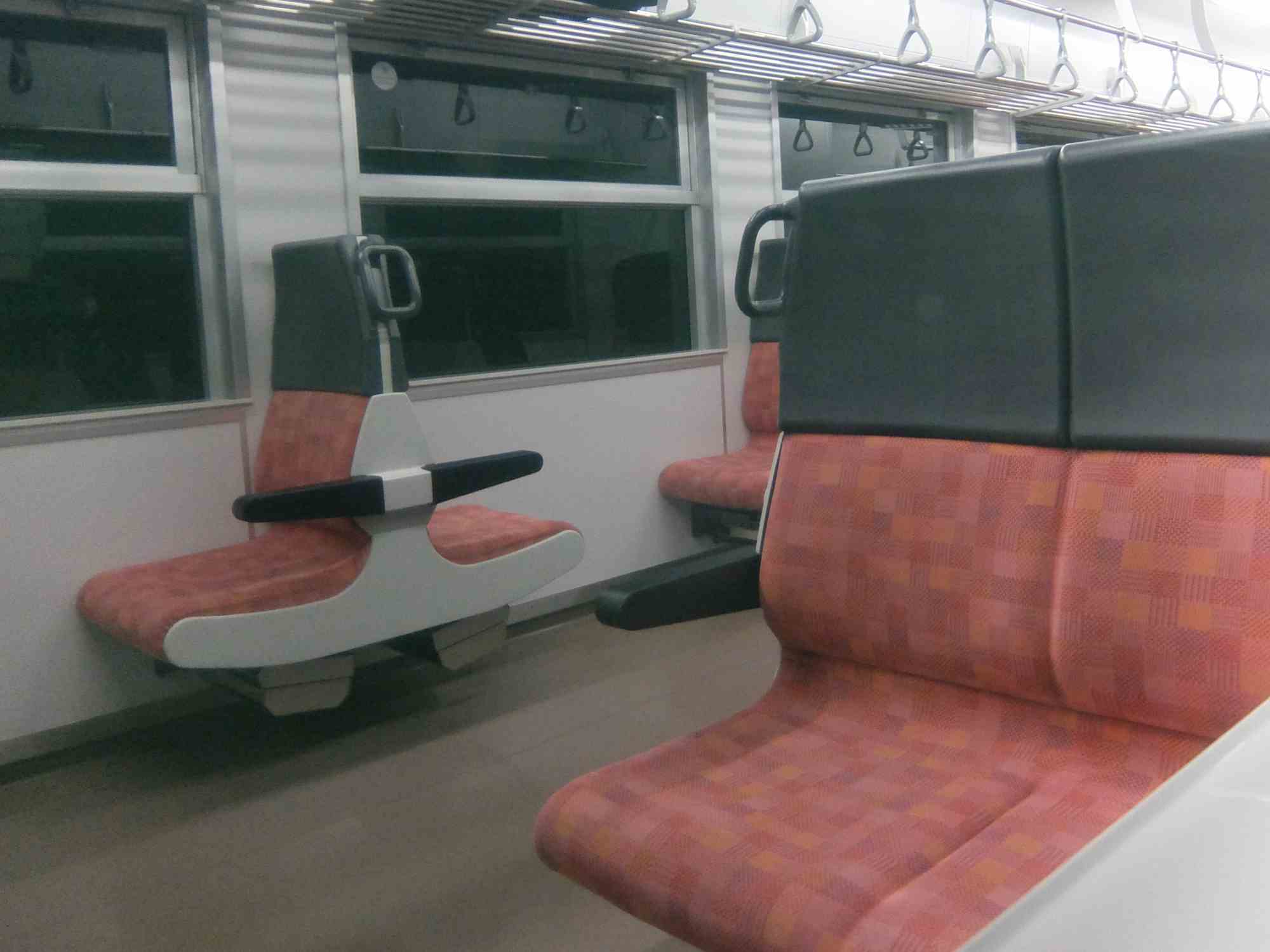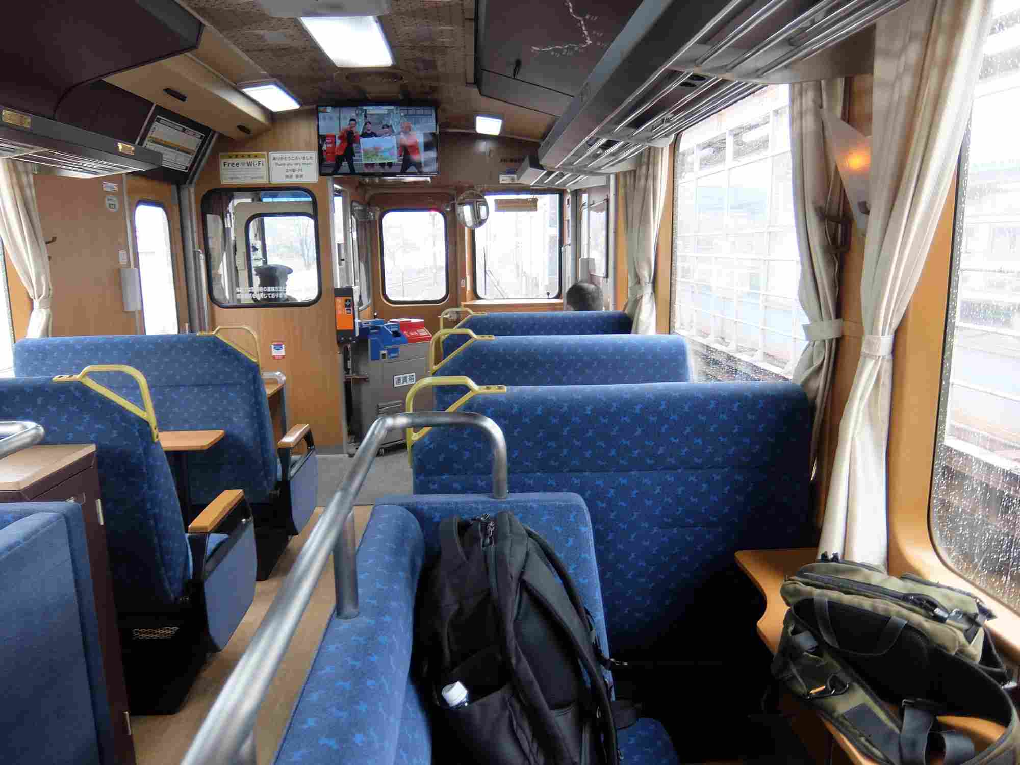 車内はこんな座席のレイアウトで私は窓に向ったベンチシートに座りました。