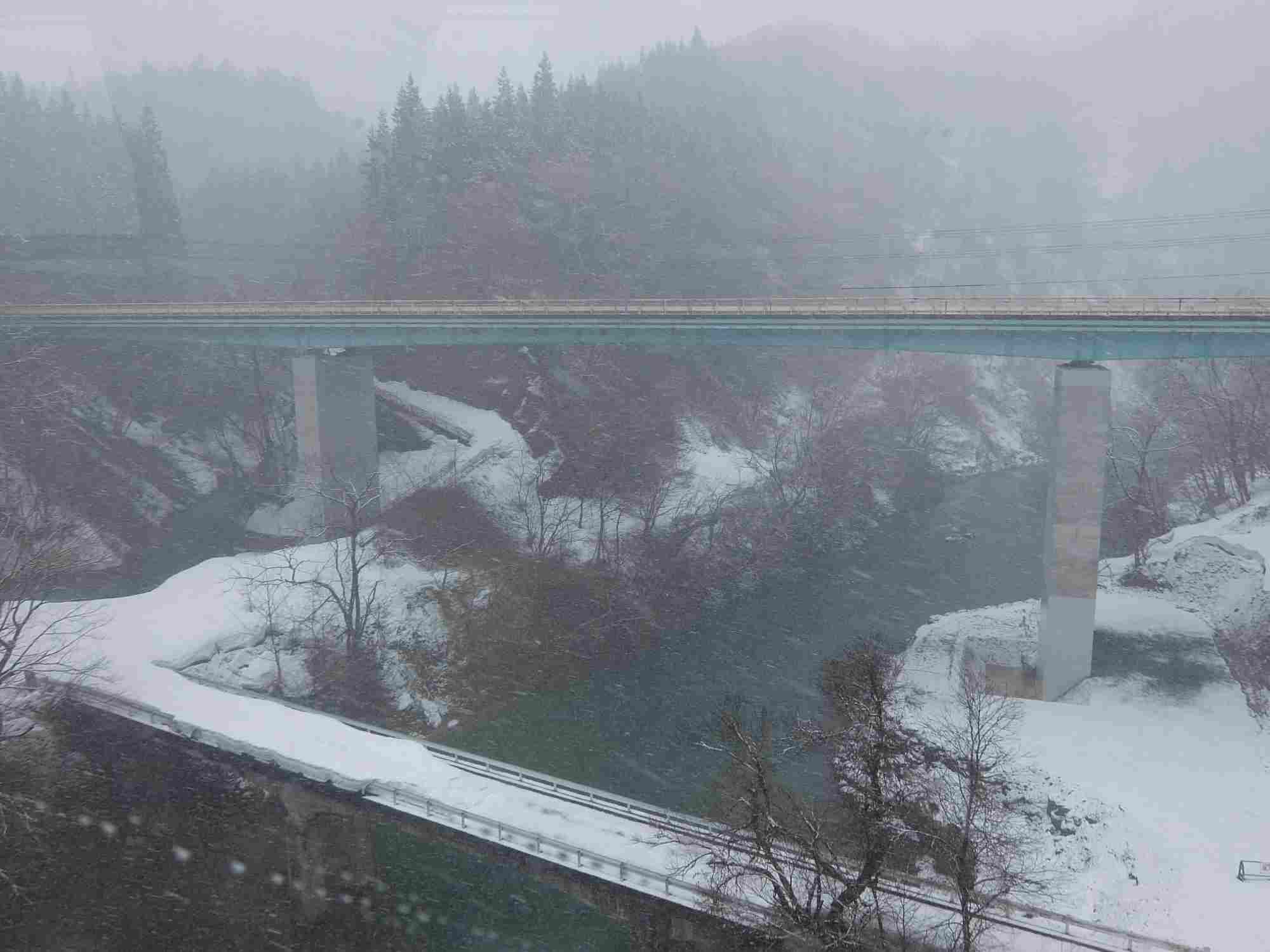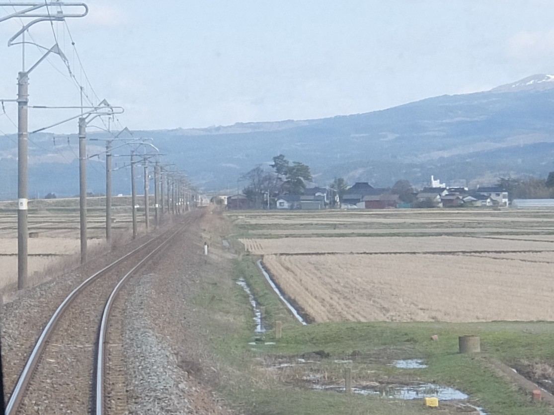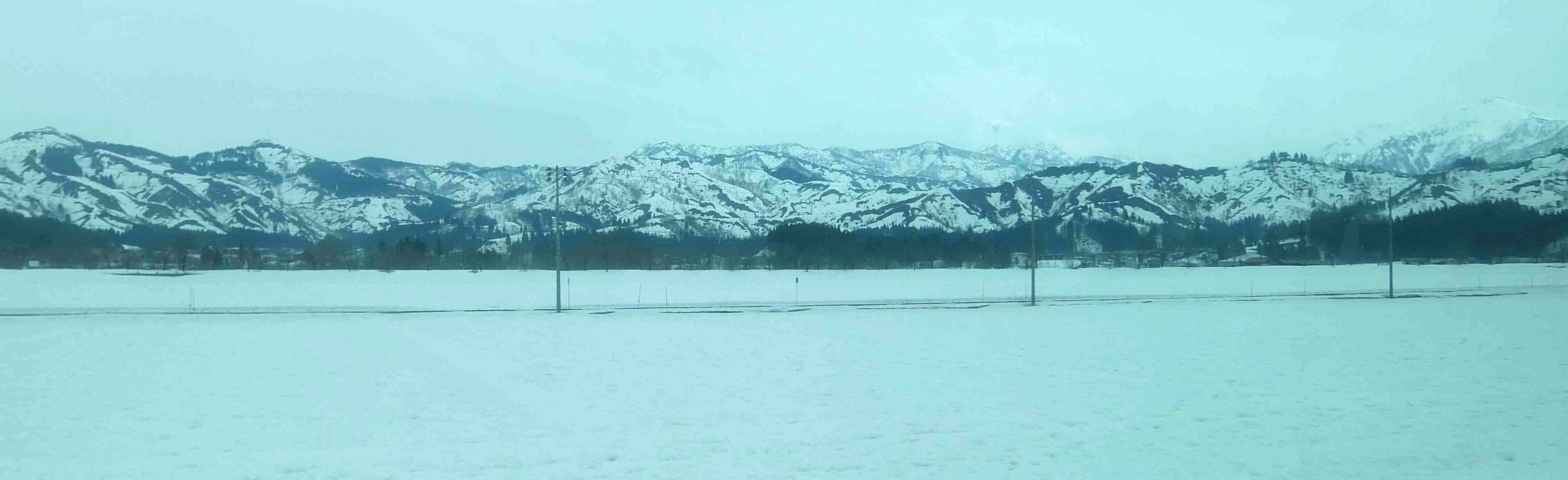 上越の山をくぐり抜けて新潟に入るとまだ雪深い景色でした。
