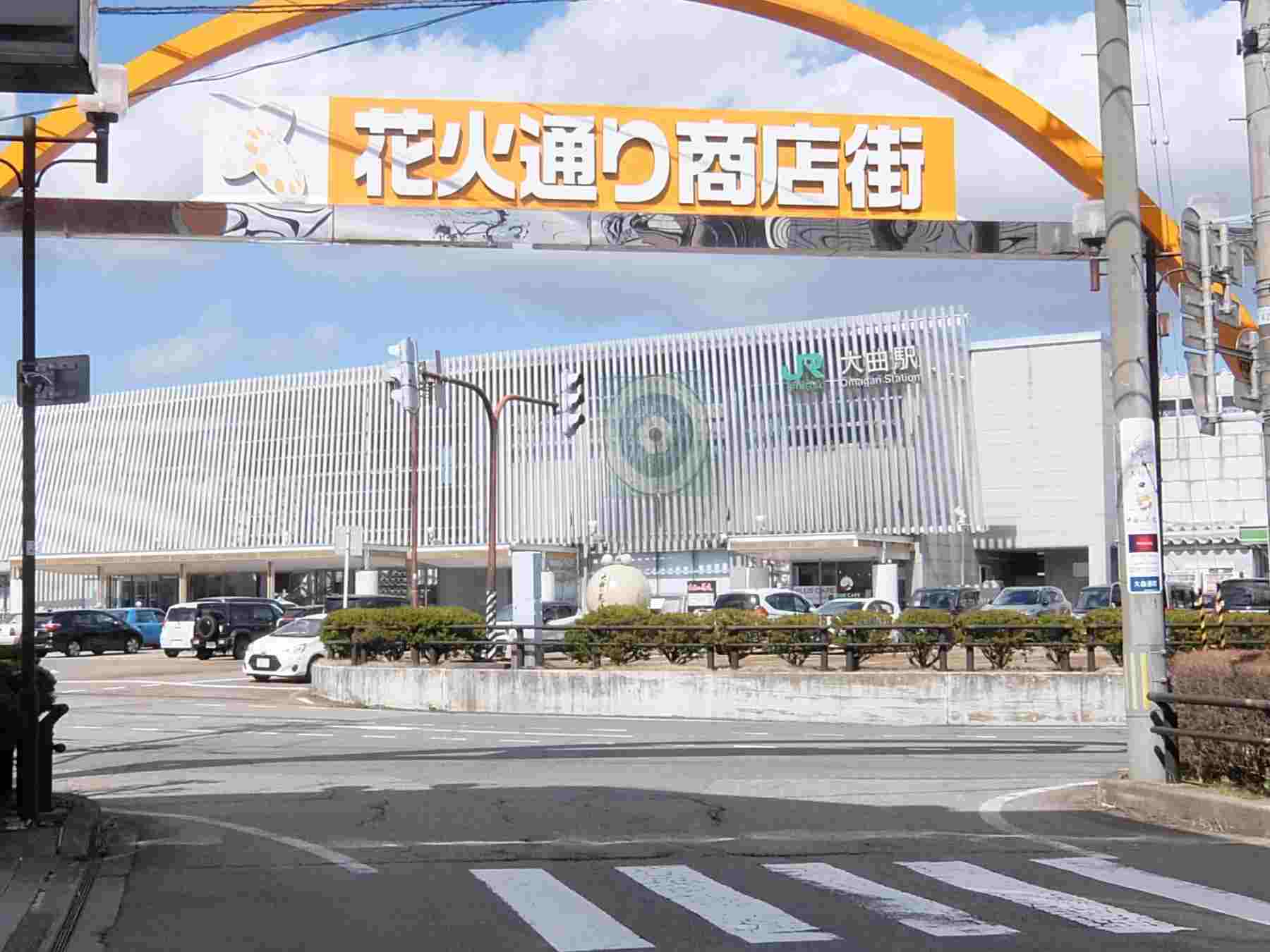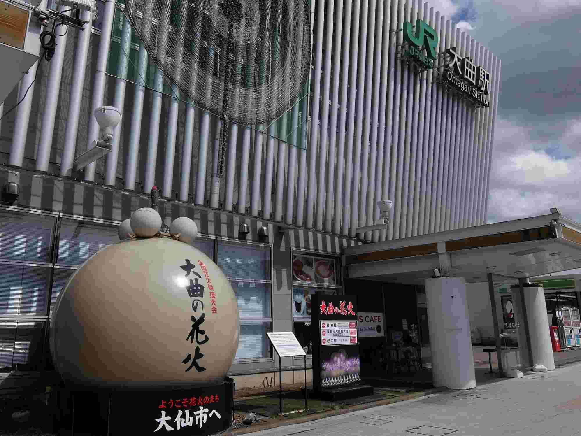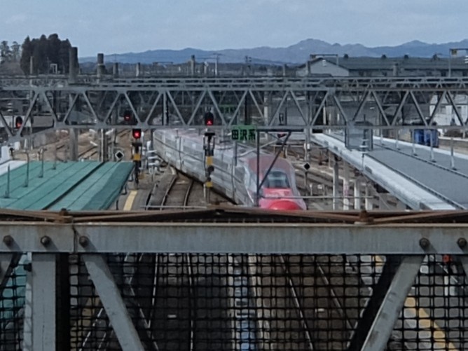 大曲に到着。秋田新幹線”こまち”が駅を出て行きました。