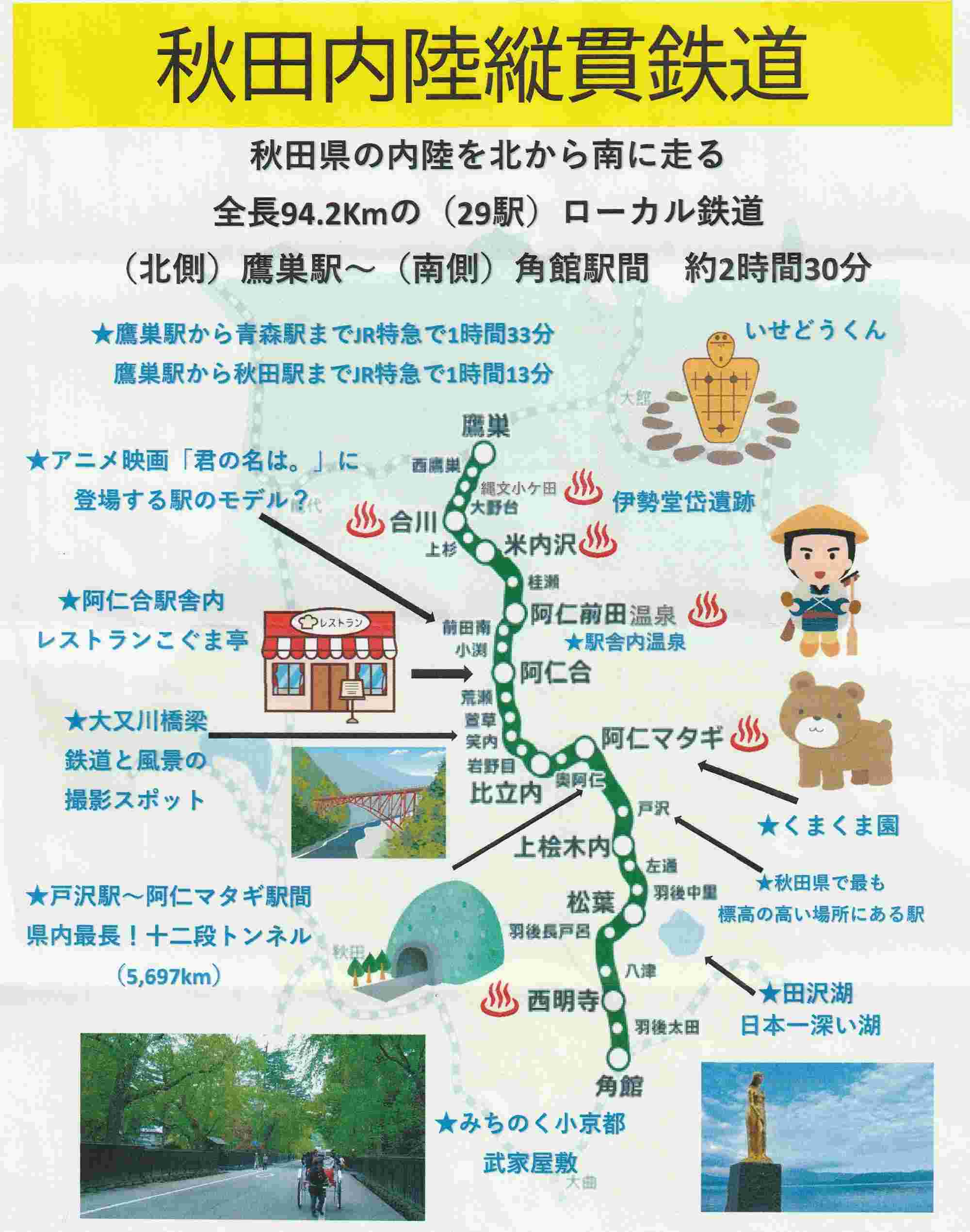 名前のとおり秋田の内陸部を縦貫している鉄道です。