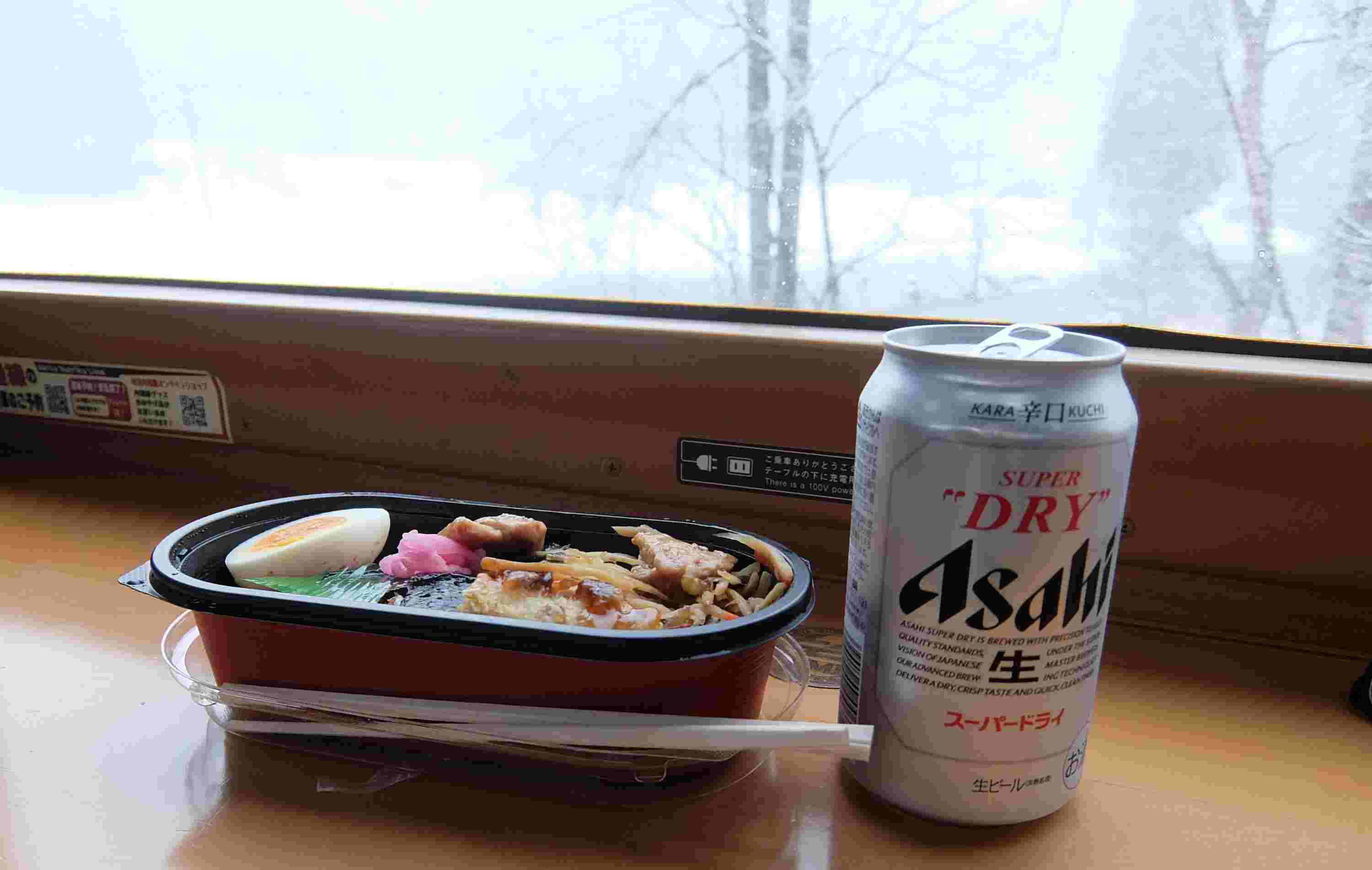 雪景色を見ながらの昼食にビール