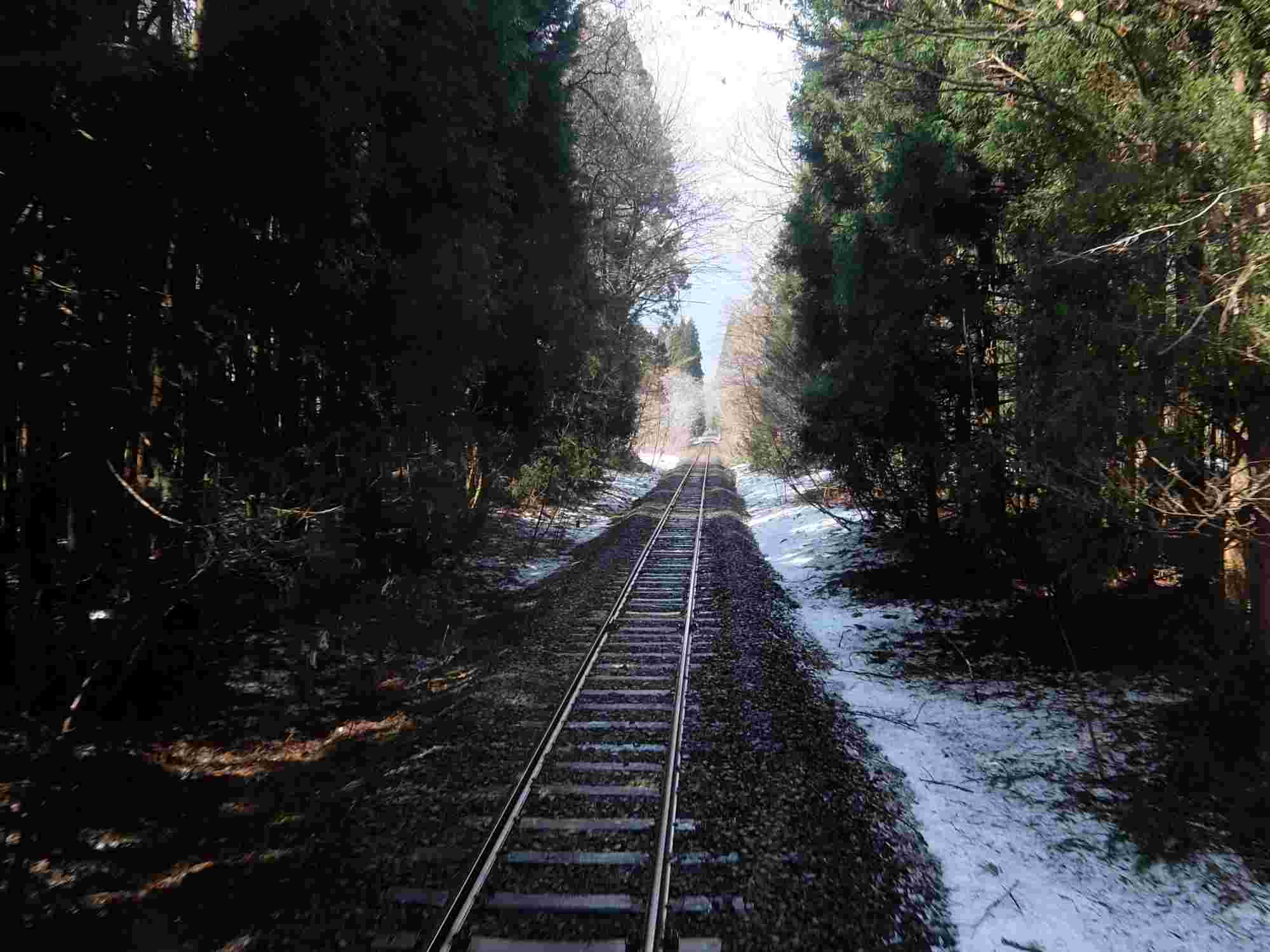 海岸から離れて海が見えなくなったので先頭に行って伸びるレールを撮ってみました。