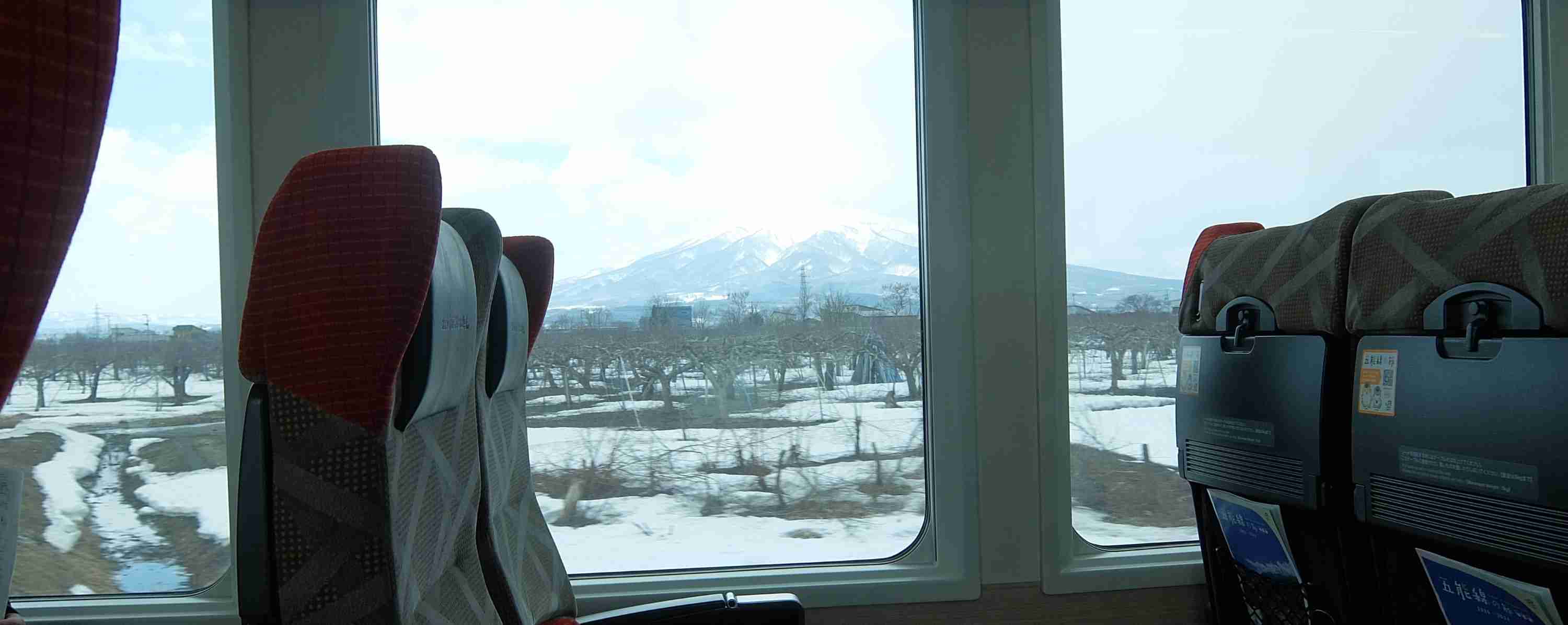 乗った列車は、”青池”でした。車窓からはリンゴ畑の先に岩木山。