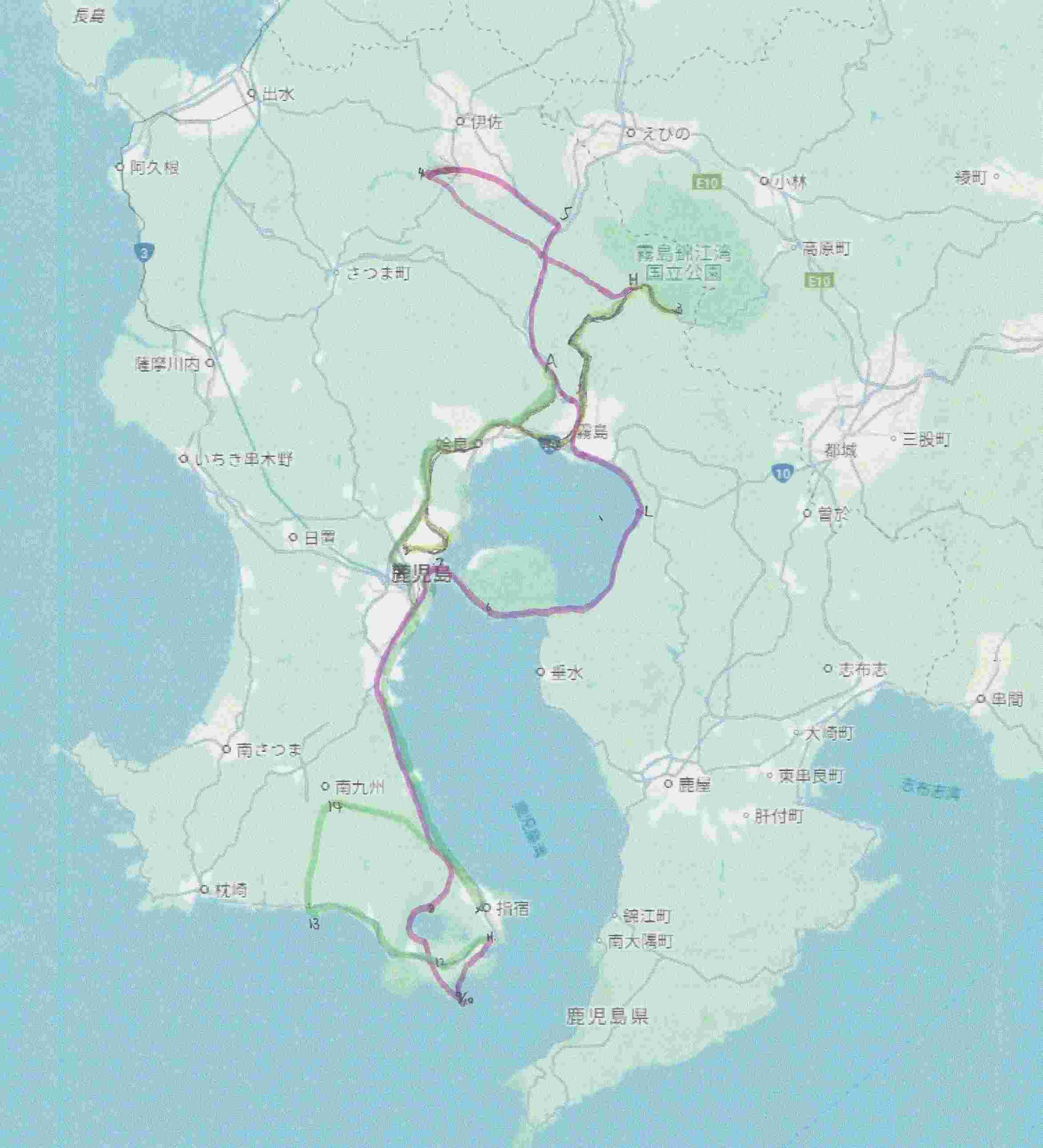 霧島温泉→曽木の滝→丸沼湧水→桜島→<フェリー>→池田湖→竜宮神社・長崎鼻→指宿温泉