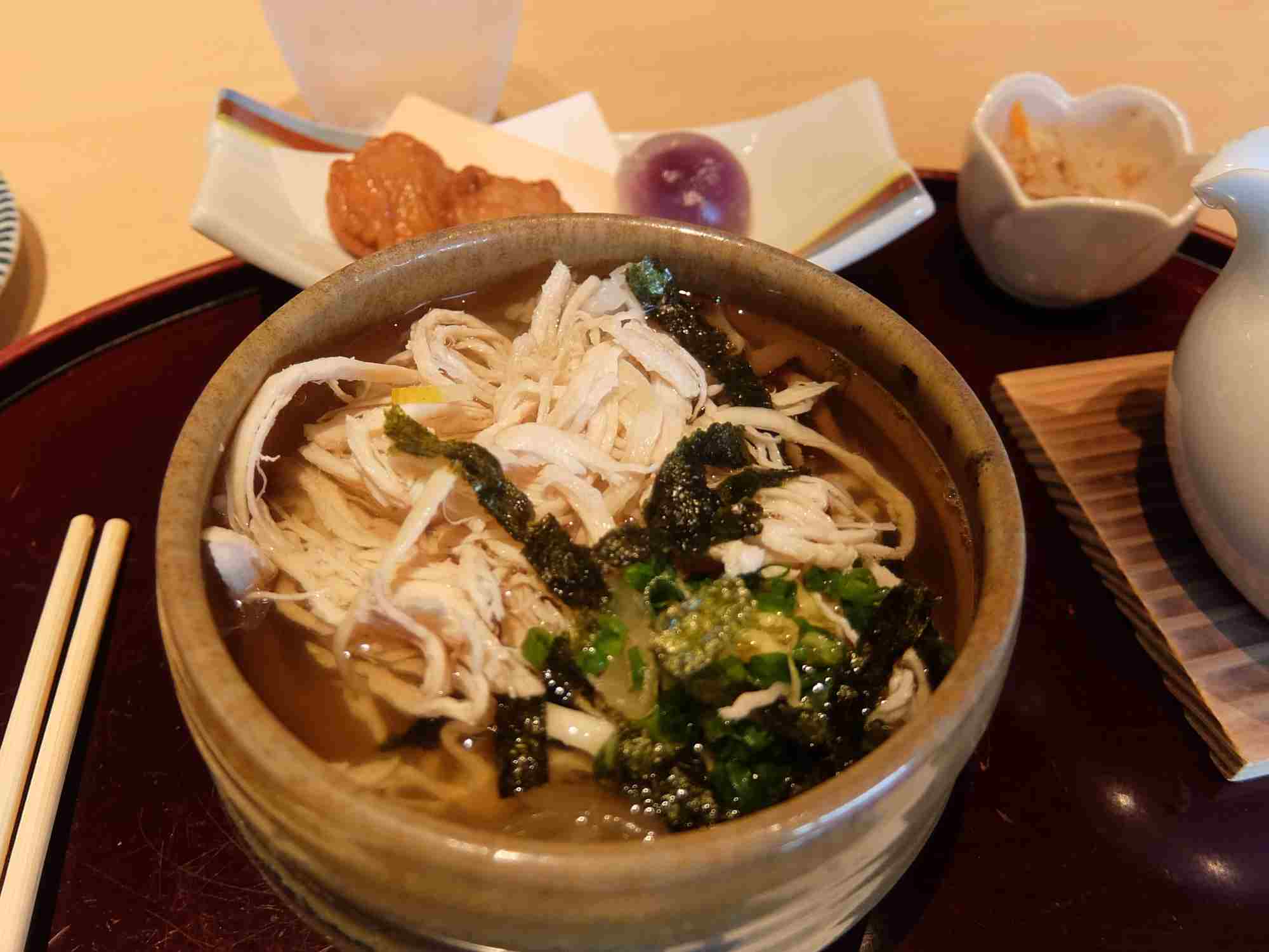 蒸し鶏やしいたけなどの食材をご飯の上にのせ鶏がらスープをかけた「鶏飯ランチ」と