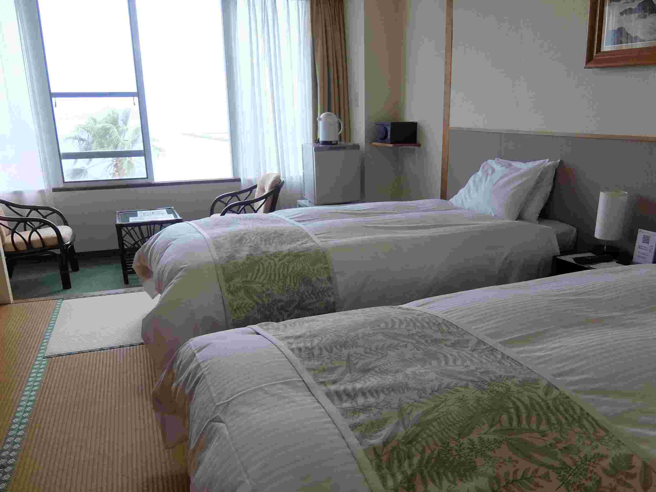 部屋からは向かいにホテルが見えて、その先に錦江湾と桜島が微かに見えました。