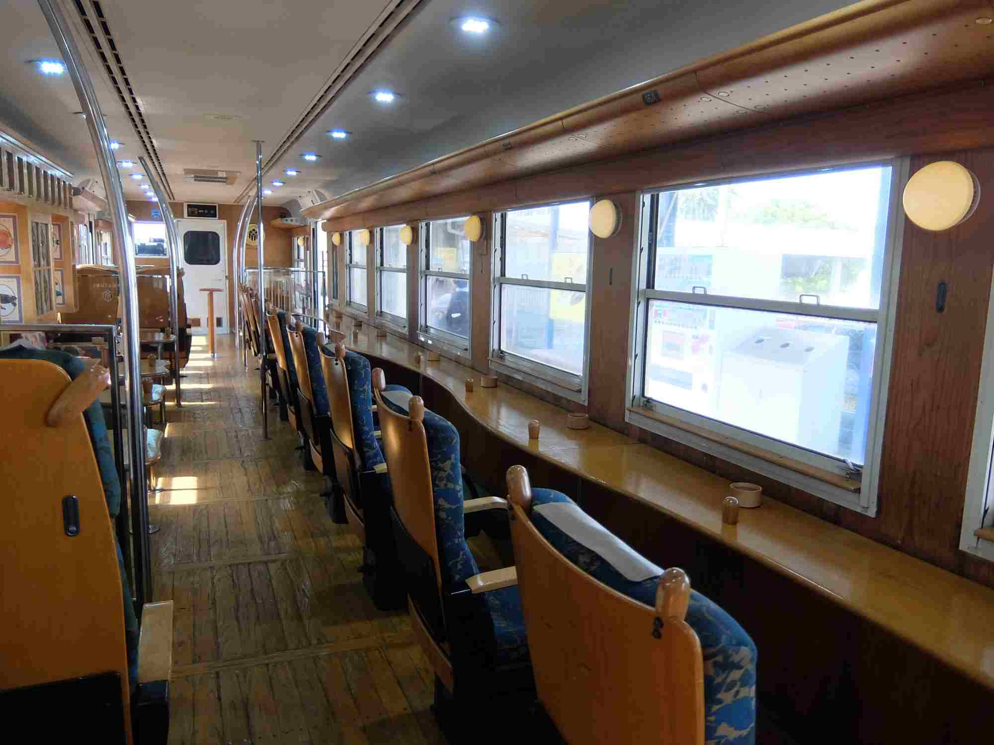 車内は2人掛けリクライニングシート、海側の窓側を向いた1人掛け席などがありますが