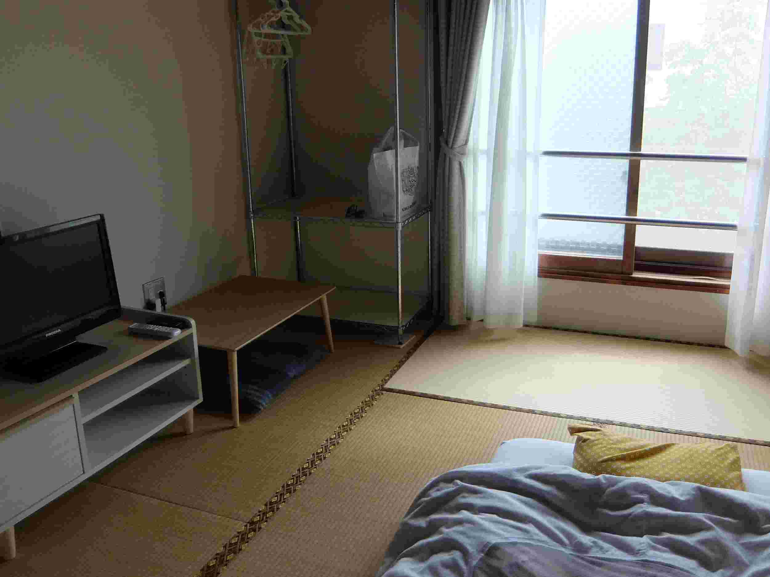 畳の部屋にお布団、TVにエアコンもある 天国のようです