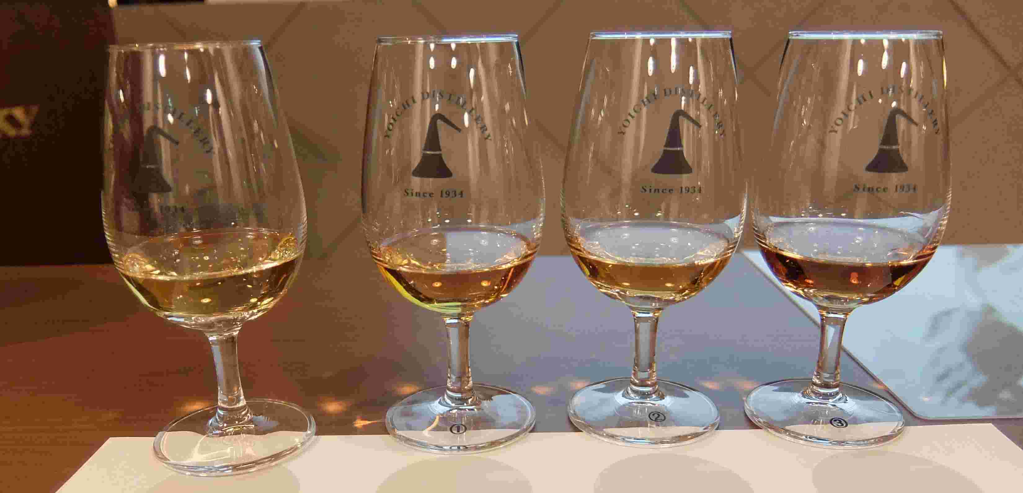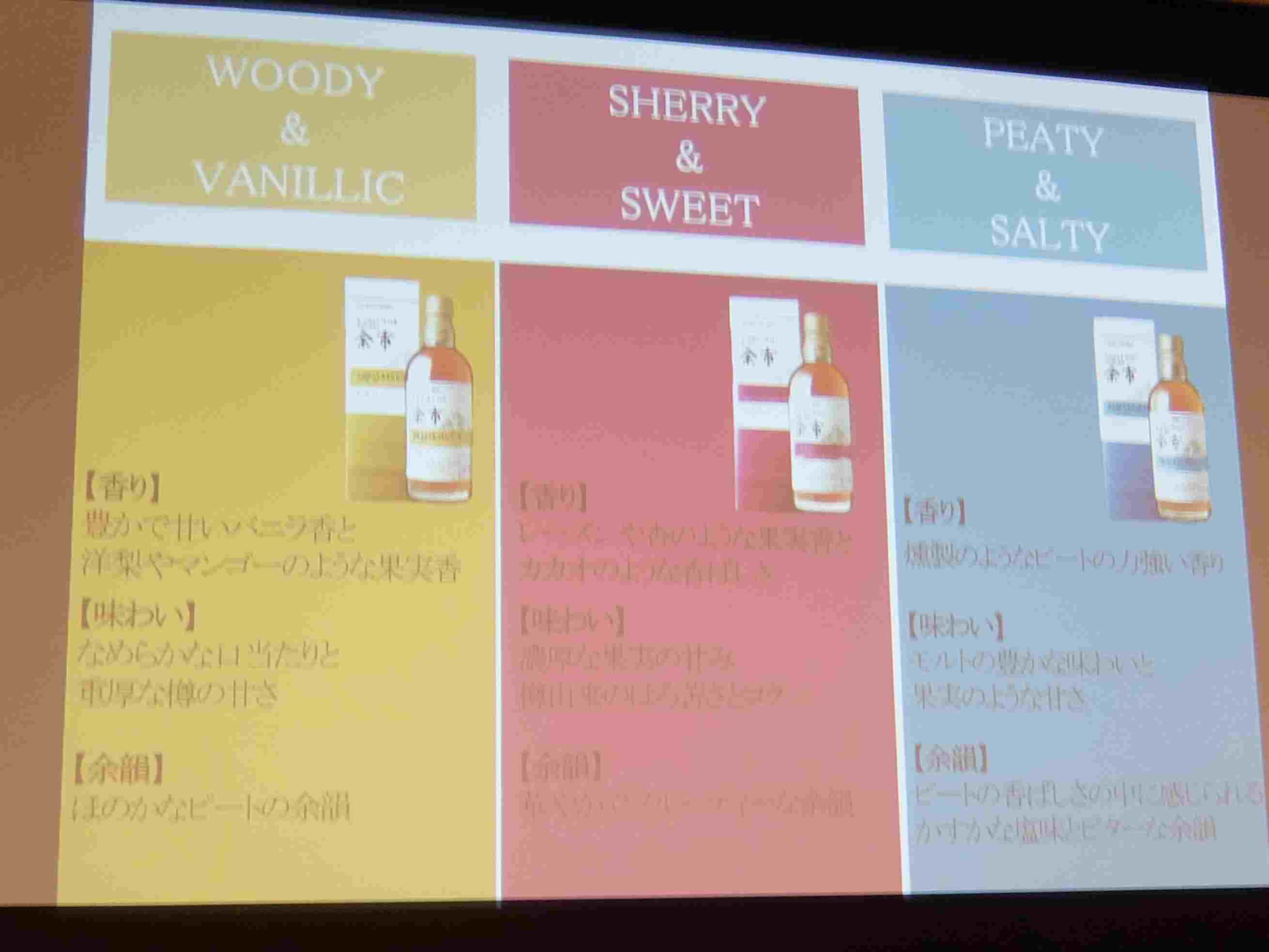 席の前には、SINGLE MALT YOICHI, WOODY & VANILLIC, SHERRY & SWEET, PEATY & SALTY