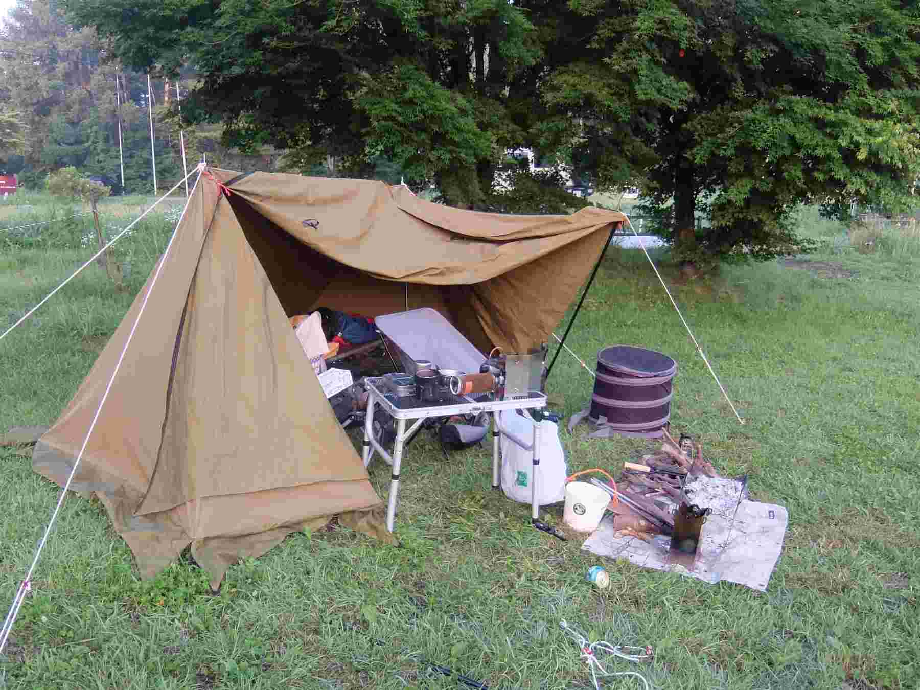 一息ついたところでテントを設営。木の奥に車を駐めています。