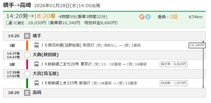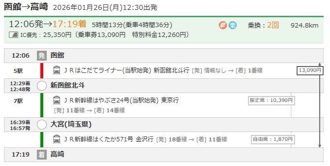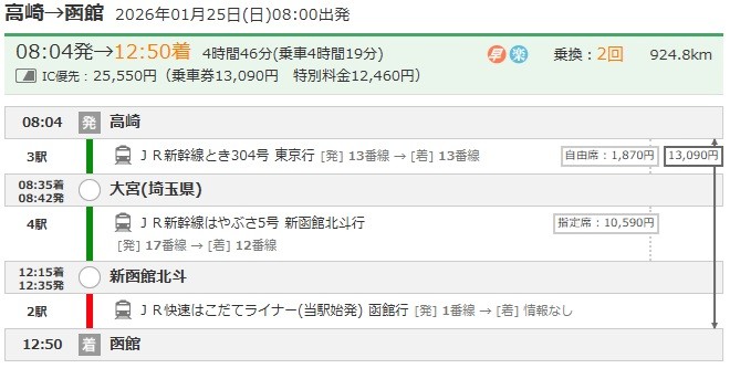 高崎から上越新幹線で大宮まで移動し、大宮から東北新幹線で一挙に新函館北斗へ