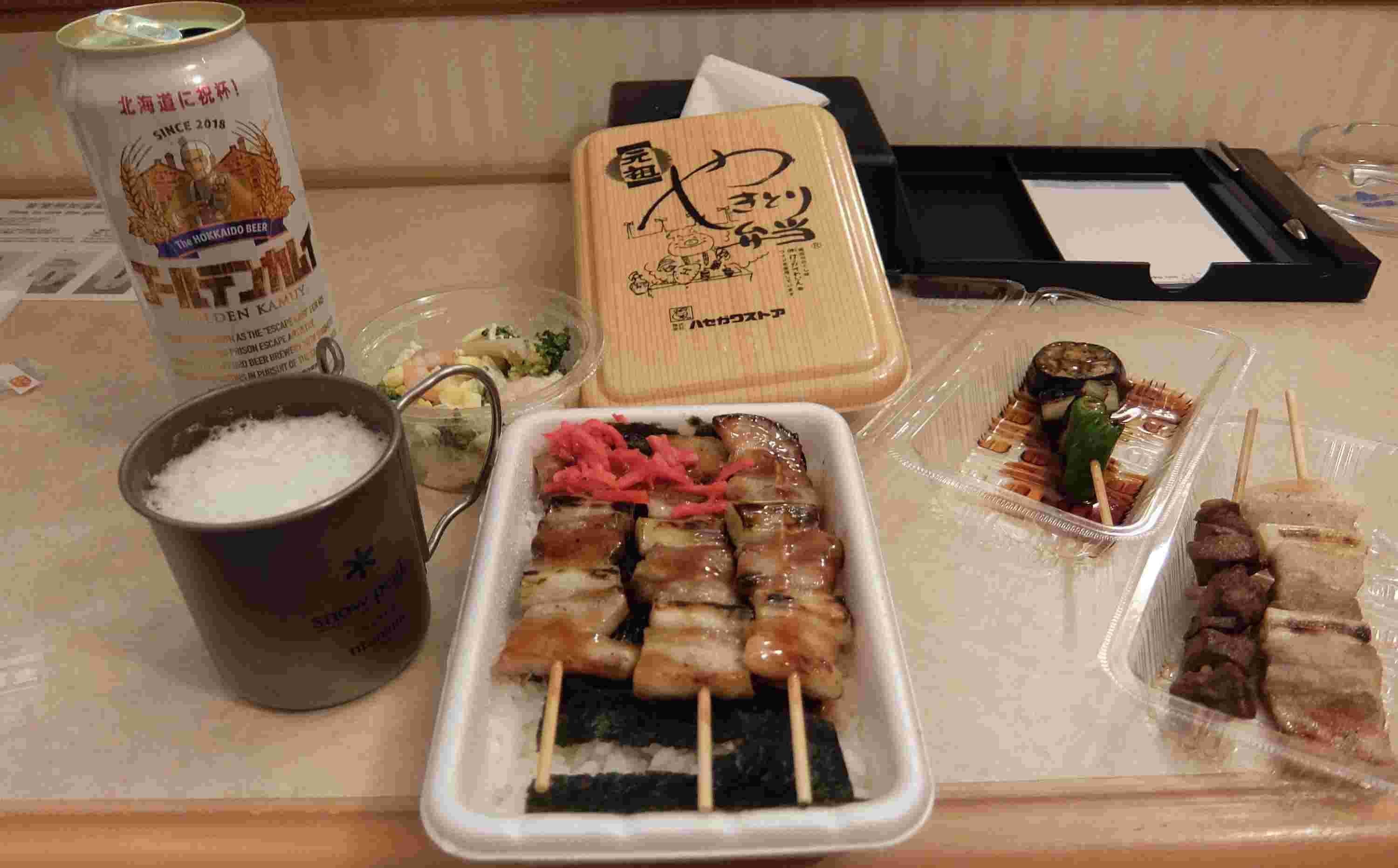 函館に来た目的その2は、ハセガワストアの”やくとり弁当”(串焼き3本追加)