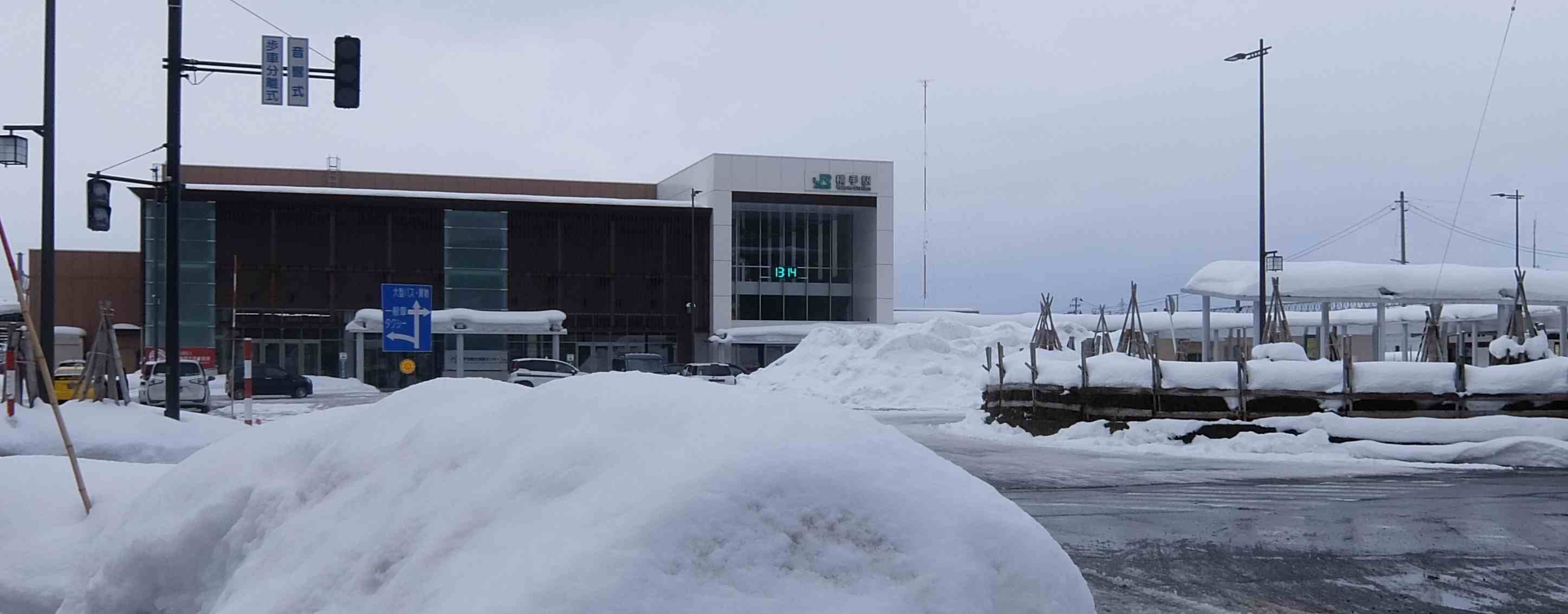 やっと辿り着いた横手駅前には除雪された雪が山になっていた。