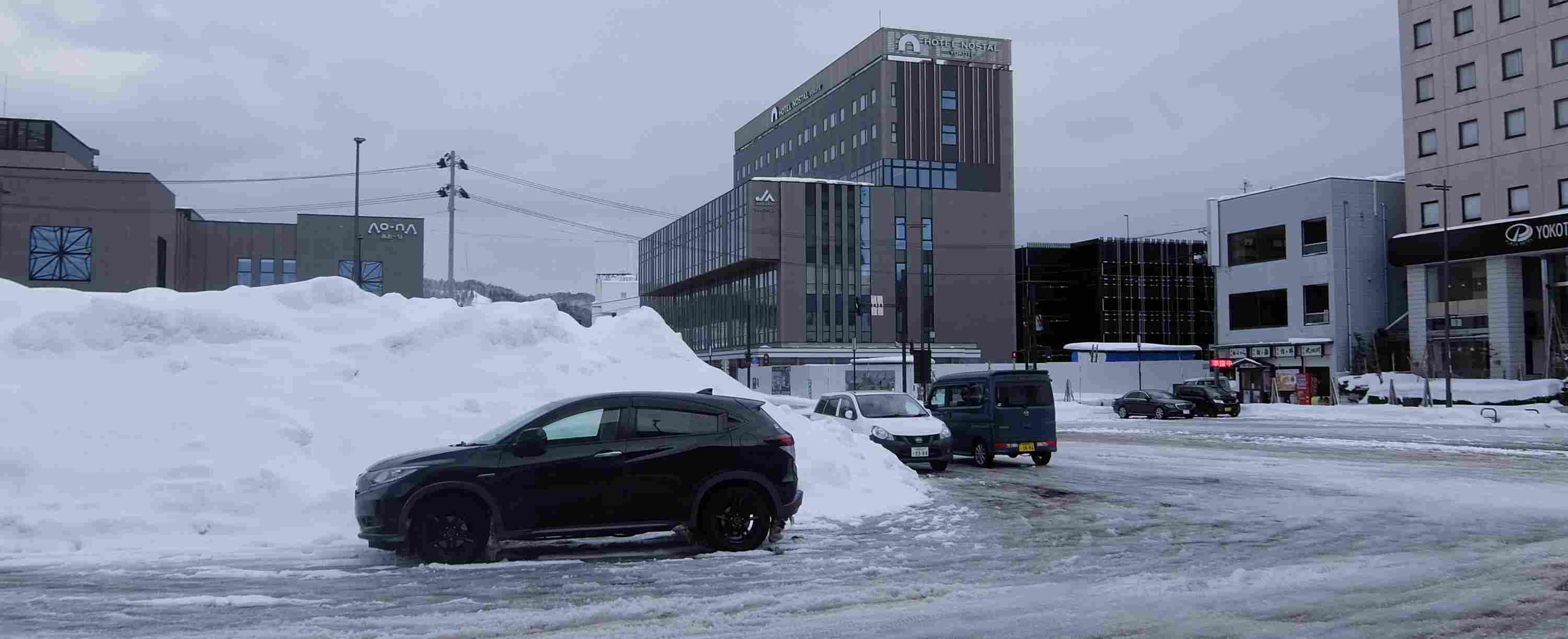 駅前、あるのはレンターカー店とホテルと北斗市観光交流センター(ほっくる)