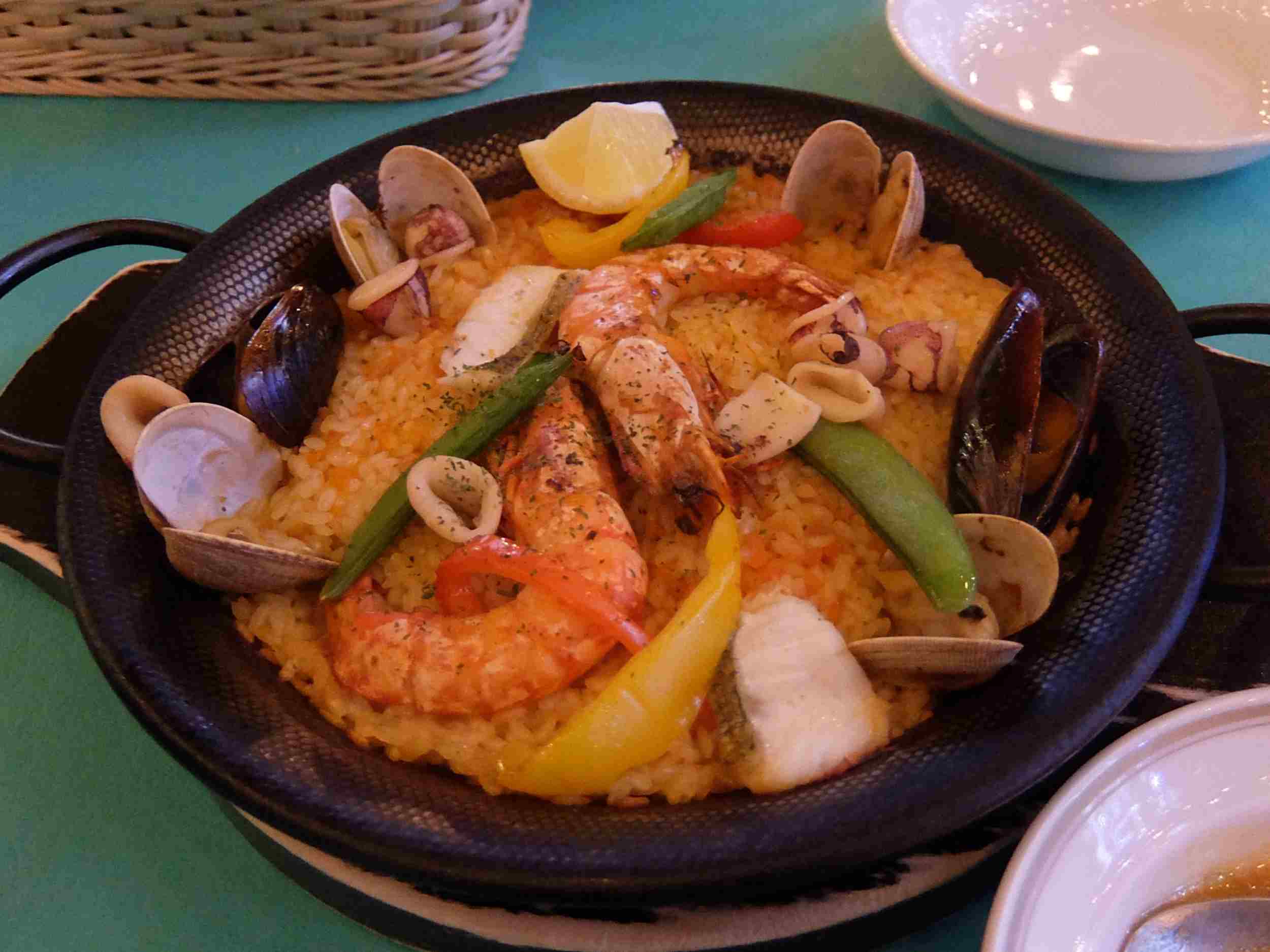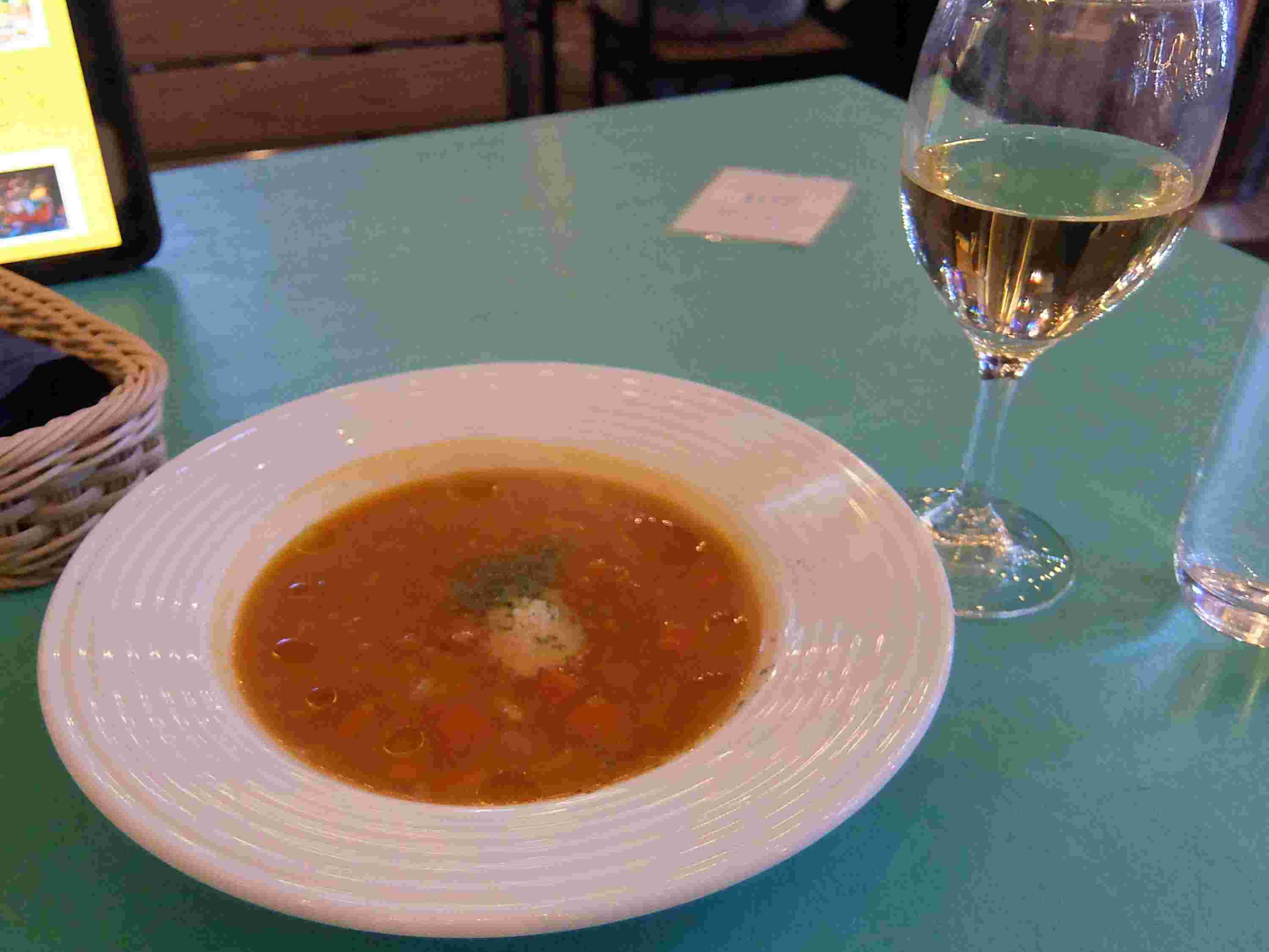 頼んだのは、ミネストローネとパエリアに白ワイン
